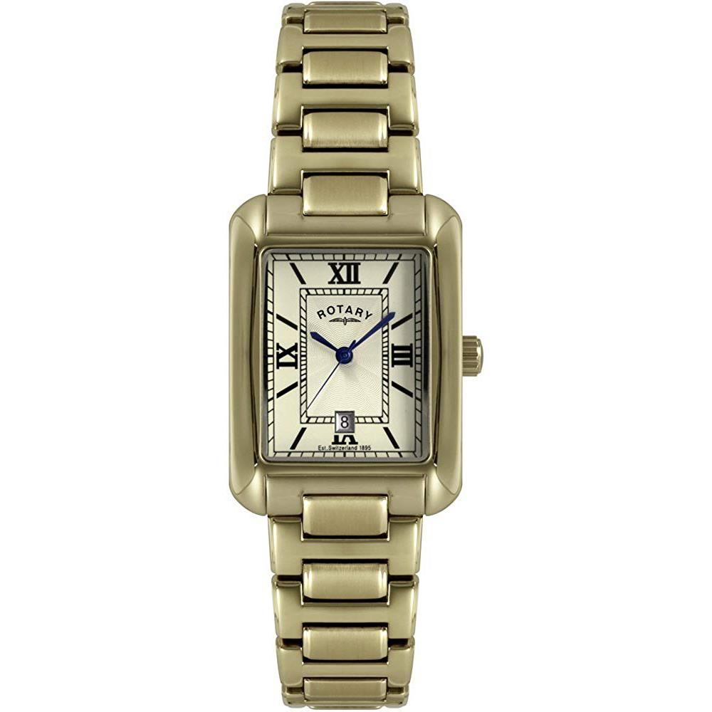 روتاری با طراحی روزانه طلایی رنگ با بند فلزی و قاب مستطیل با صفحه کرم و موتور سوییسی با قابلیت تقویم و انرژی باطری به همراه دو سال گارانتی بین المللی شرکت جام جم