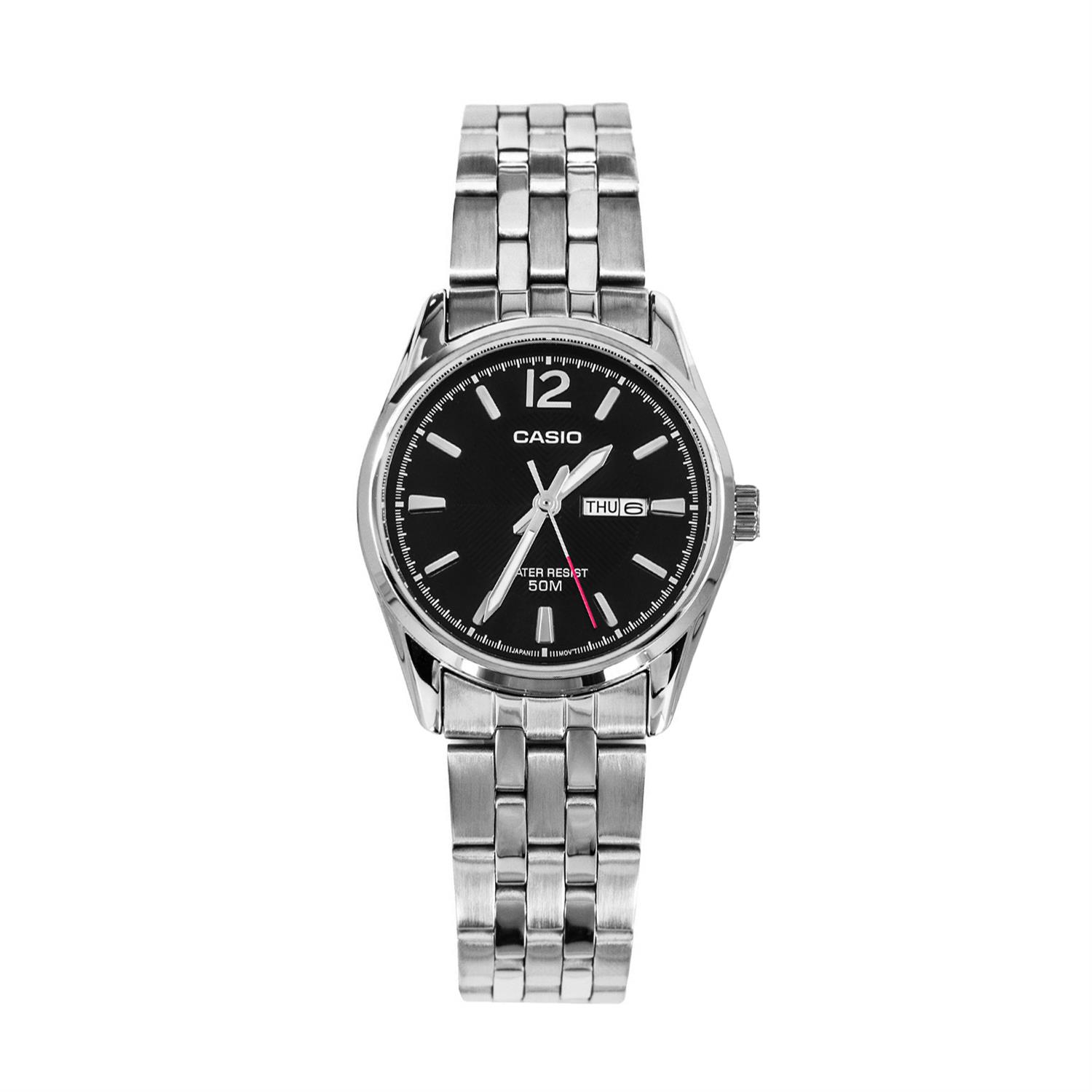 ساعت مچی زنانه/دخترانه کاسیو CASIO با طراحی ساده بند فلزی با قاب گرد و صفحه مشکی با موتور کوارتز و قابلیت تقویم روز و ماه با انرژی باطری و مقاوم در برابر آب تا عمق 50 متر از خانواده Dress این ساعت مچی زنانه به همراه یک سال گارانتی بین المللی شرکت پارس ارائه میگردد