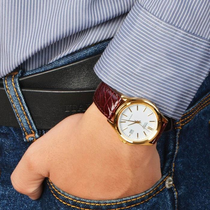 ساعت مچی مردانه/پسرانه کاسیو CASIO با طراحی ساده بند چرم قهوه ای با قاب گرد ظریف طلایی رنگ و صفحه سفید با موتور ژاپنی و کاربرد تقویم و انرژی باطری از خانواده ENTICER این ساعت مچی مردانه به همراه یک سال گارانتی بین المللی شرکت پارس ارائه میگردد