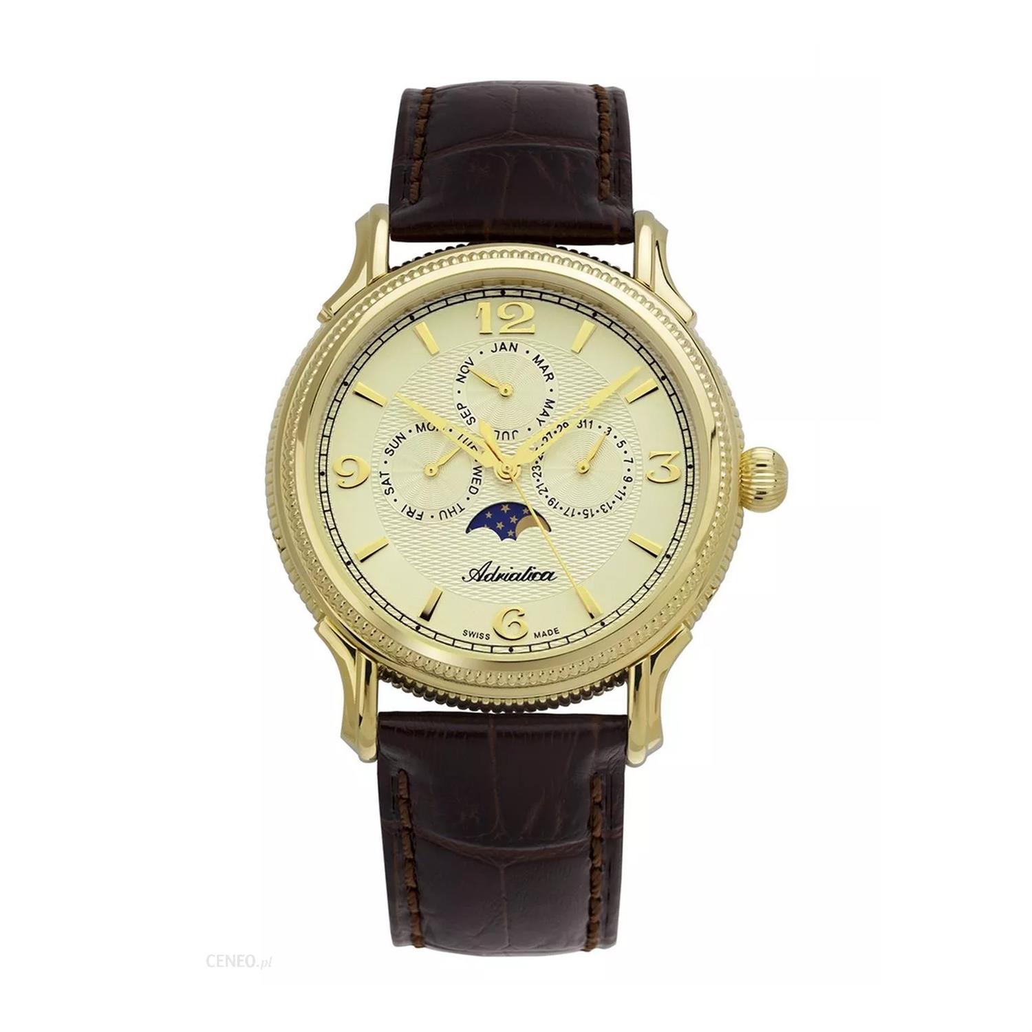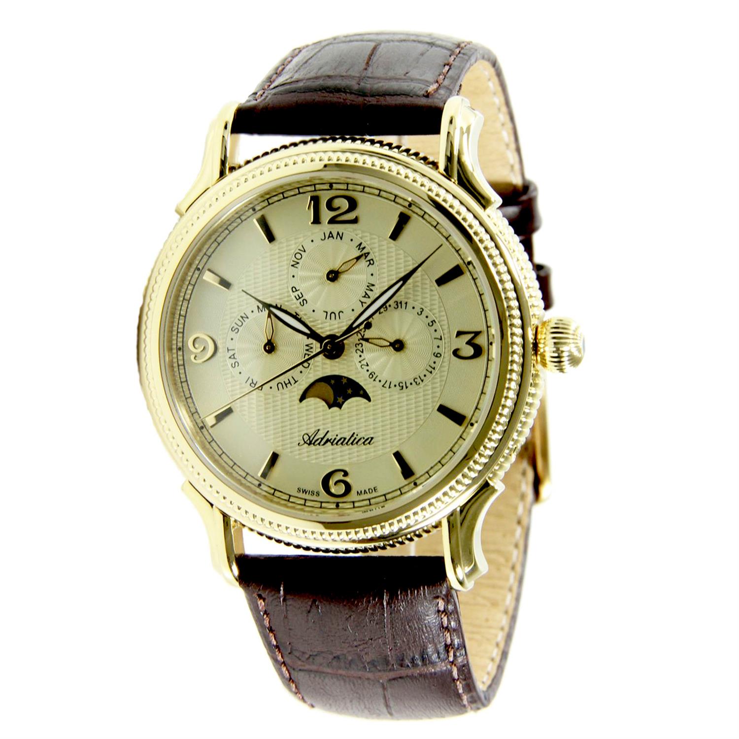 ساعت مچی مردانه/پسرانه آدریاتیکا ADRIATICA با طراحی روزانه بند چرم قهوه ای با قاب و صفحه گرد طلایی رنگ با موتور سوییسی و قابلیت تقویم روز و ماه,مون فیس,ماههای میلادی با انرژی باطری و مقاوم در برابر آب تا عمق 50 متراین ساعت مچی به همراه دو سال گارانتی بین المللی شرکت آدریاتیکا ارائه میگردد