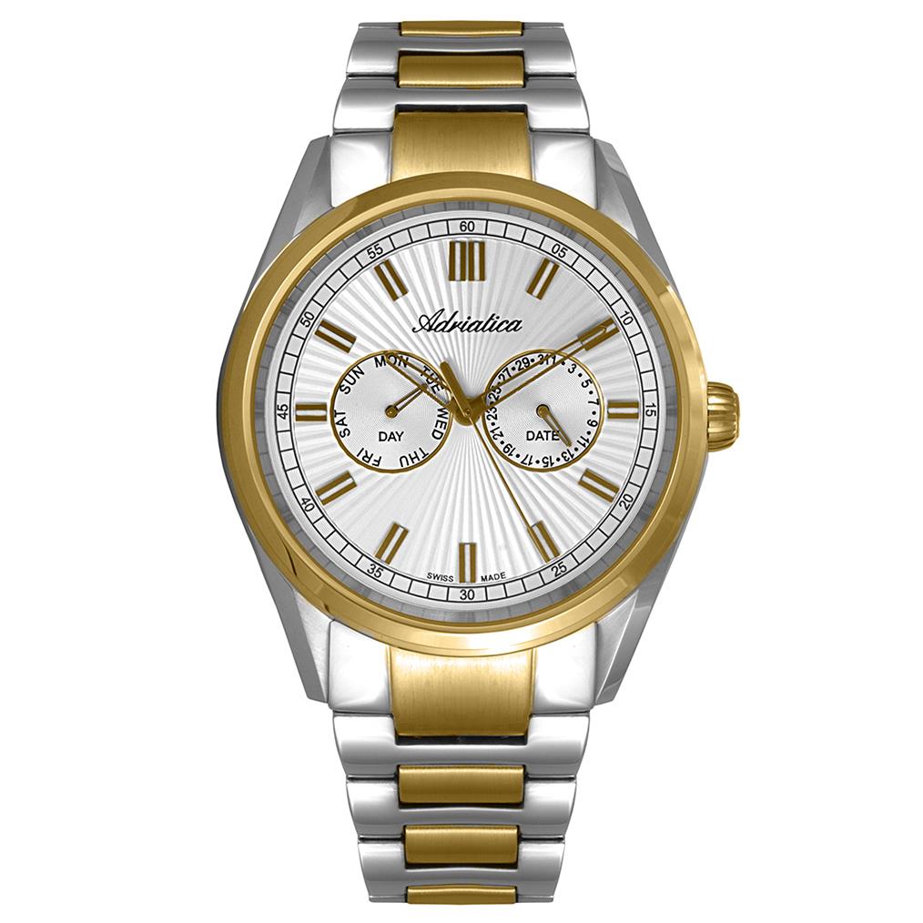ساعت مچی مردانه/پسرانه آدریاتیکا ADRIATICA با طراحی روزانه دو رنگ با بند فلزی و قاب گرد و صفحه سفید مشجر با موتور سوییسی و قابلیت تقویم روز و ماه با انرژی باطری و مقاوم در برابر آب تا عمق 50 متراین ساعت مچی به همراه دو سال گارانتی بین المللی شرکت آدریاتیکا ارائه میگردد