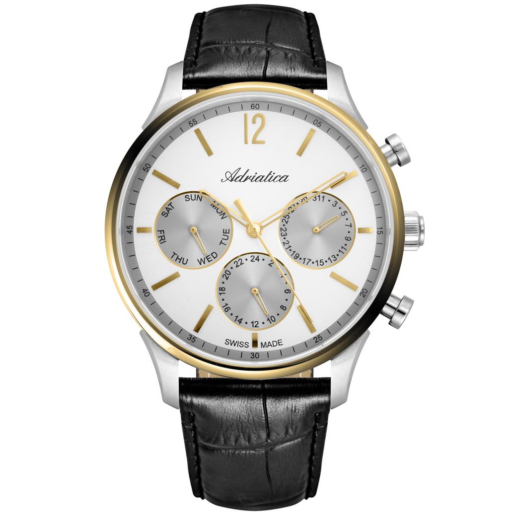 ساعت مچی مردانه/پسرانه آدریاتیکا ADRIATICA با طراحی روزانه بند چرم مشکی با قاب و صفحه گرد دو رنگ با موتور سوییسی و کاربرد تقویم روز و ماه ,زمان دوم با انرژی باطری و مقاوم در برابر آب تا عمق 50 متراین ساعت مچی با شیشه ضد خراش به همراه دو سال گارانتی بین المللی شرکت آدریاتیکا ارائه میگردد