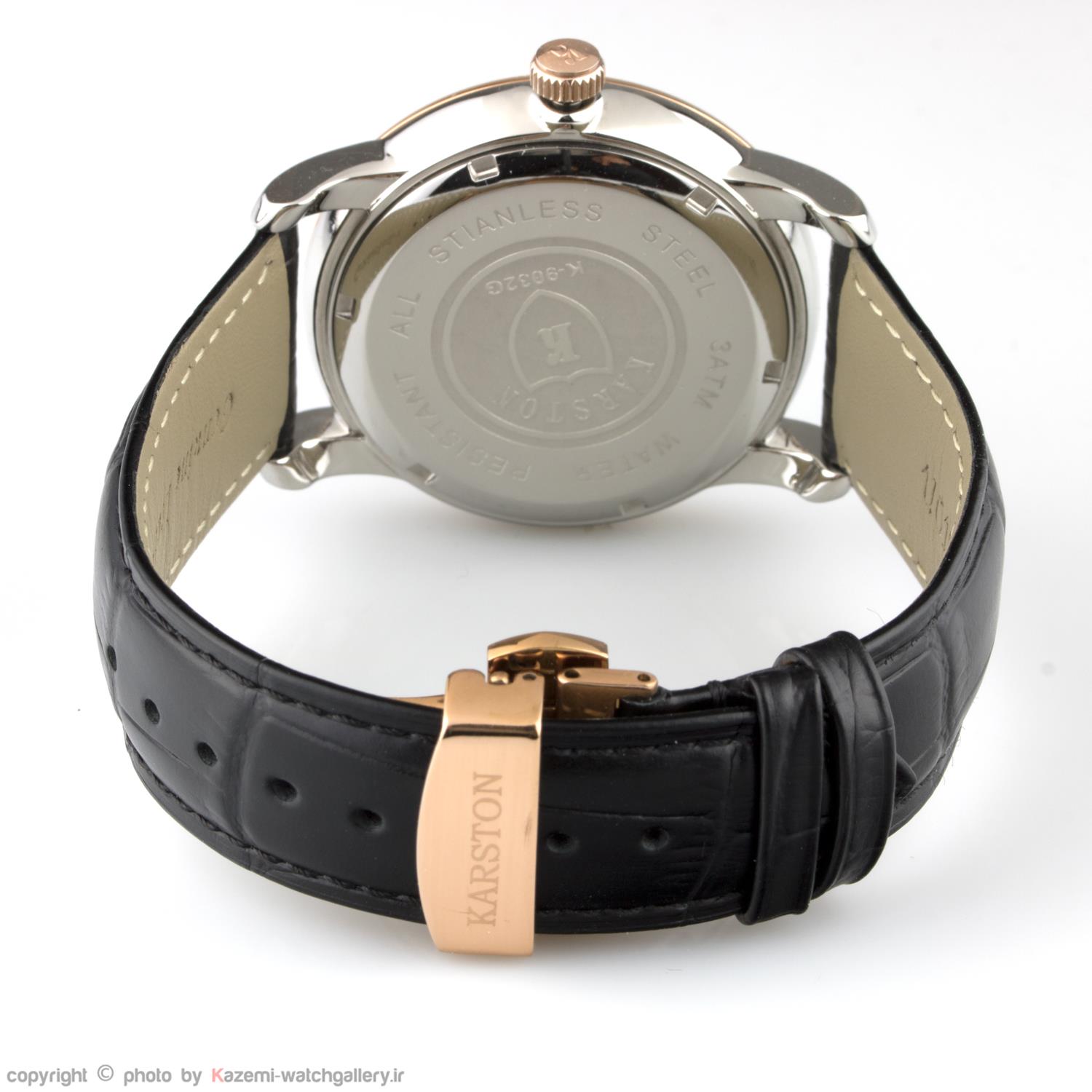 ساعت مچی کارستون KARSTON مردانه/پسرانه با طراحی ساده بند چرم مشکی مجهز به قفل کلیپسی با قاب گرد دو رنگ و صفحه مشکی مزین به 4 نگین با شیشه ضد خراش و موتور ژاپنی با انرژی باطری و مقاوم در برابر آب تا عمق 30 متر با کاربرد تقویم روز و ماه به همراه دو سال گارانتی شرکت کارستون در ایران