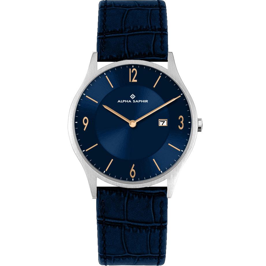 ساعت مچی مردانه/پسرانه آلفاسفیرALPHA SAPHIR با طراحی کلاسیک بند چرم سرمه ای و قاب گرد و موتور با کاربرد تقویم این ساعت مچی مردانه با گارانتی دو ساله بین المللی شرکت آلفا سفیرارائه میگردد