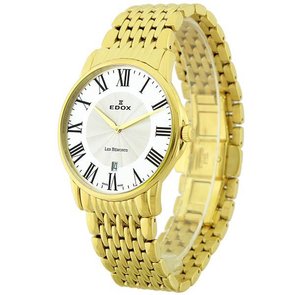 ساعت مچی مردانه ادکس EDOX  با طراحی روزانه طلایی رنگ بند فلزی با قاب گرد ظریف و صفحه سفید با درج اعداد یونانی و شیشه ضد خراش با موتور سوییسی با قابلیت تقویم و انرژی باطری و مقاوم در برابر آب تا عمق 30 متر و از خانواده Les Bemonts این ساعت مچی مردانه به همراه دو سال گارانتی بین المللی شرکت جام جم ارائه میگردد