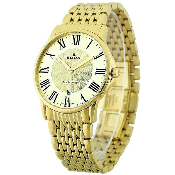 ساعت مچی مردانه ادکس EDOX  با طراحی مجلسی طلایی رنگ بند فلزی با قاب گرد ظریف و صفحه کرم رنگ با درج اعداد یونانی و شیشه ضد خراش با موتور سوییسی با قابلیت تقویم و انرژی باطری و مقاوم در برابر آب تا عمق 30 متر و از خانواده Les Bemonts این ساعت مچی مردانه به همراه دو سال گارانتی بین المللی شرکت جام جم ارائه میگردد