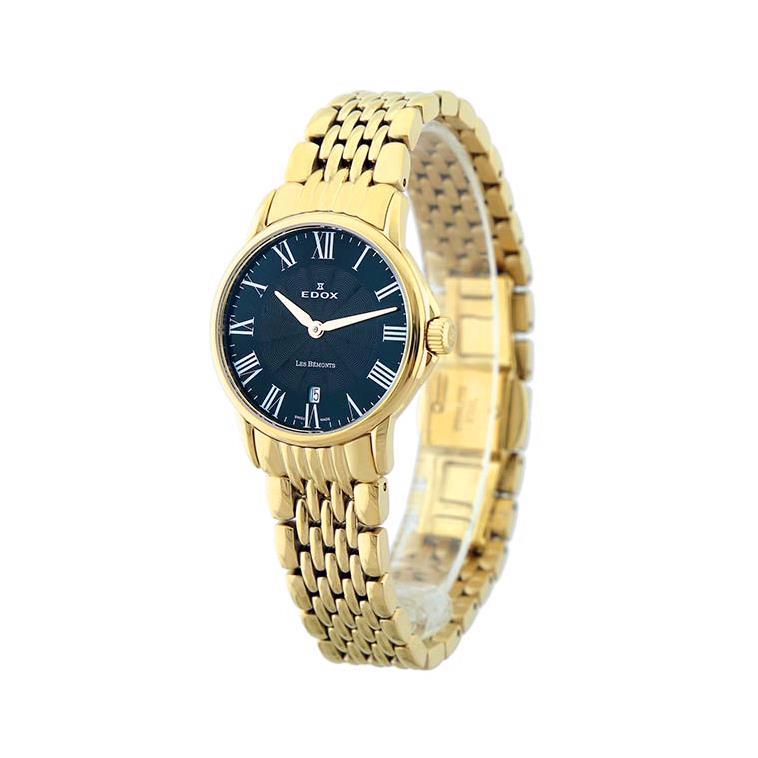 ساعت مچی زنانه ادکس EDOX  با طراحی روزانه طلایی رنگ بند فلزی با قاب گرد و صفحه مشکی با درج اعداد یونانی و شیشه ضد خراش با موتور سوییسی با قابلیت تقویم و انرژی باطری و مقاوم در برابر آب تا عمق 30 متر و از خانواده Les Bemonts این ساعت مچی زنانه به همراه دو سال گارانتی بین المللی شرکت جام جم ارائه میگردد