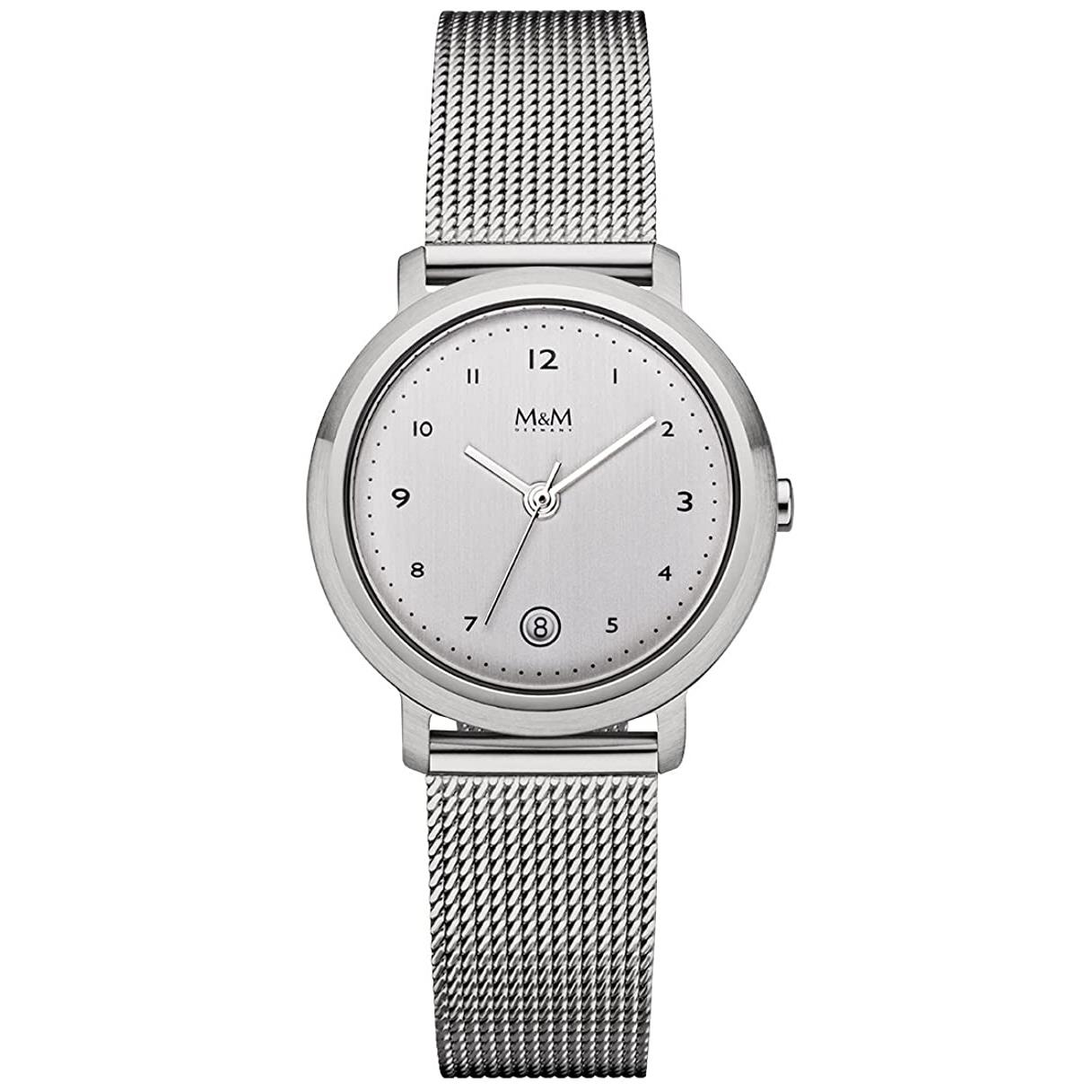 ام اند ام M&M با طراحی روزانه بند فلزی حصیربافت با قاب گرد و صفحه نقره ای با درج اعداد انگلیسی و موتور ژاپنی با قابلیت تقویم و انرژی باطری و مقاوم در برابر آب تا عمق 30 متر با قابلیت ضد حساسیت بودن به همراه دو سال گارانتی بین المللی شرکت ام اند ام