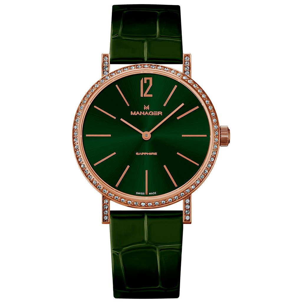 منیجر MANAGER با طراحی روزانه سبز رنگ با بند چرم و قاب گرد رزگلد دور نگین با شیشه ضد خراش و موتور سوییسی با انرژی باطری و مقاوم در برابر آب تا عمق 50 متر به همراه دو سال گارانتی بین المللی بازرگانی زمردیان