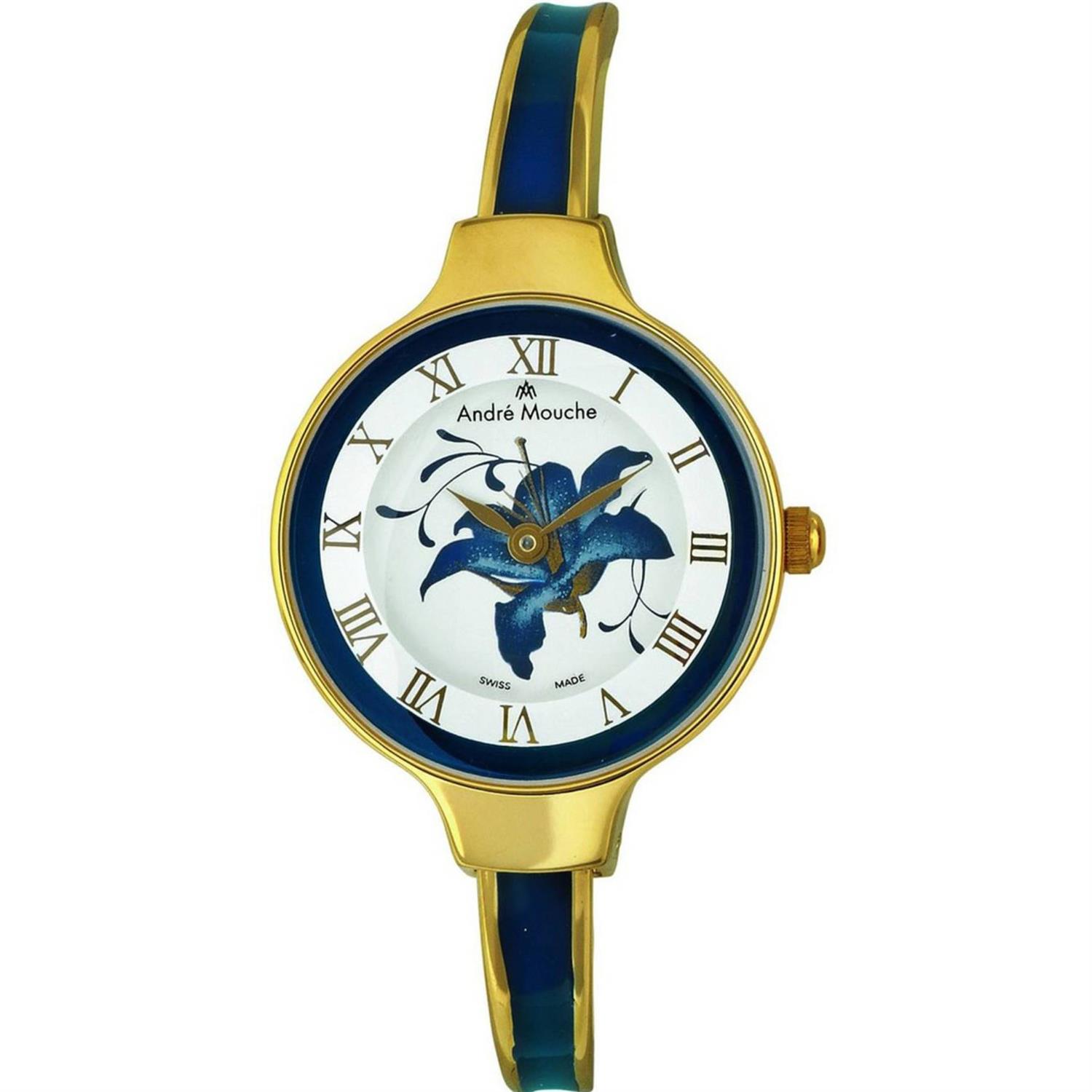 آندره موشه ANDREMOUCHE با طراحی فانتزی بند فلزی دو رنگ النگویی با قاب گرد دو رنگ و صفحه سفید منقش به گل با موتور سوییسی و انرژی باطری و مقاوم در برابر آب تا عمق 30 متر به همراه دو سال گارانتی بین المللی شرکت زمردیان
