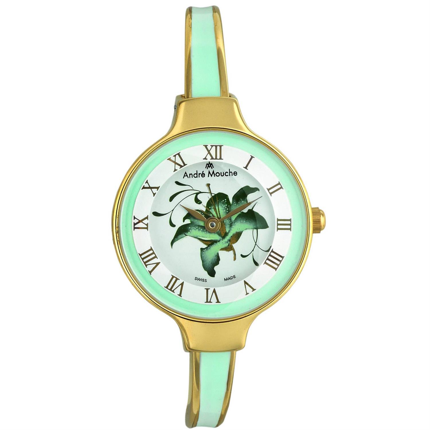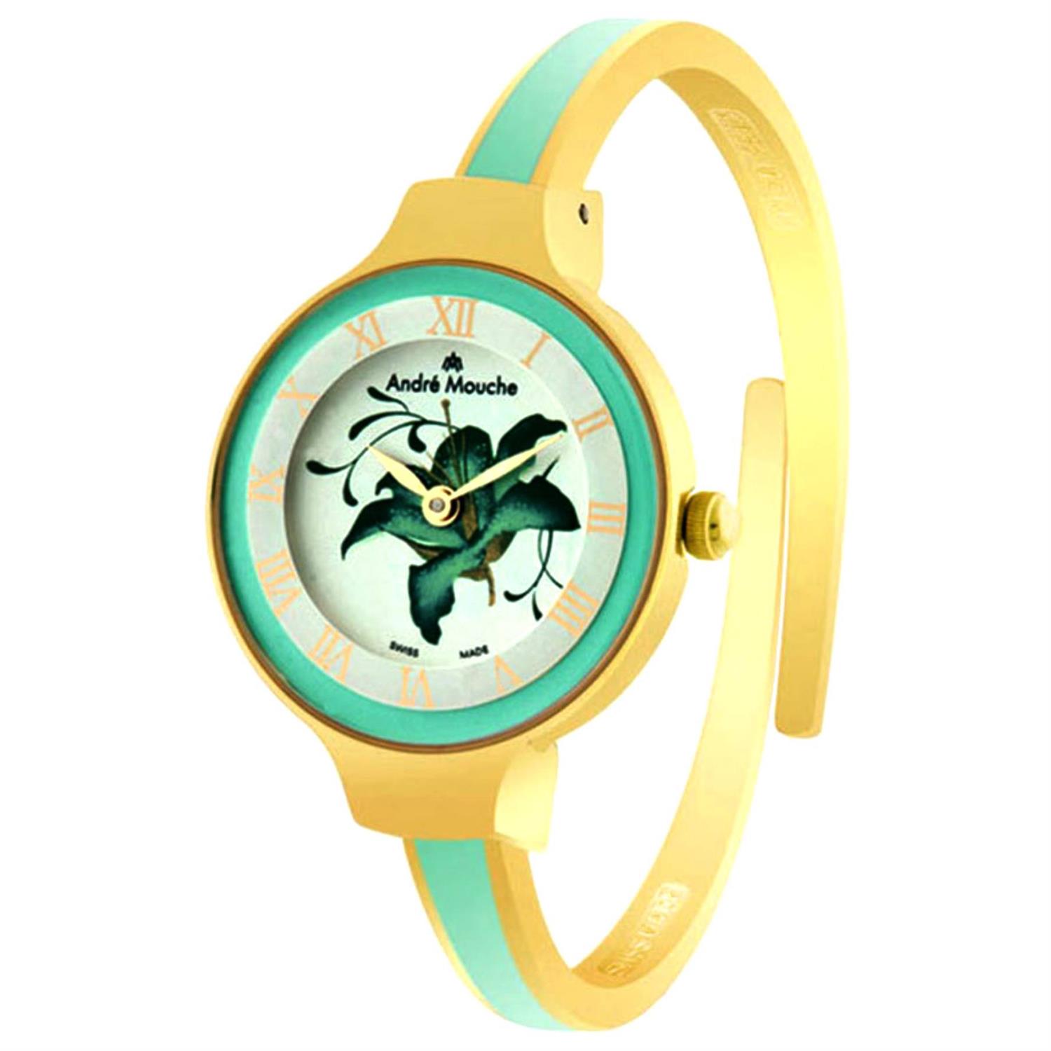 ANDREMOUCHE با طراحی فانتزی بند فلزی دو رنگ النگویی با قاب گرد دو رنگ و صفحه سفید منقش به گل با موتور سوییسی و انرژی باطری و مقاوم در برابر آب تا عمق 30 متر به همراه دو سال گارانتی بین المللی شرکت زمردیان