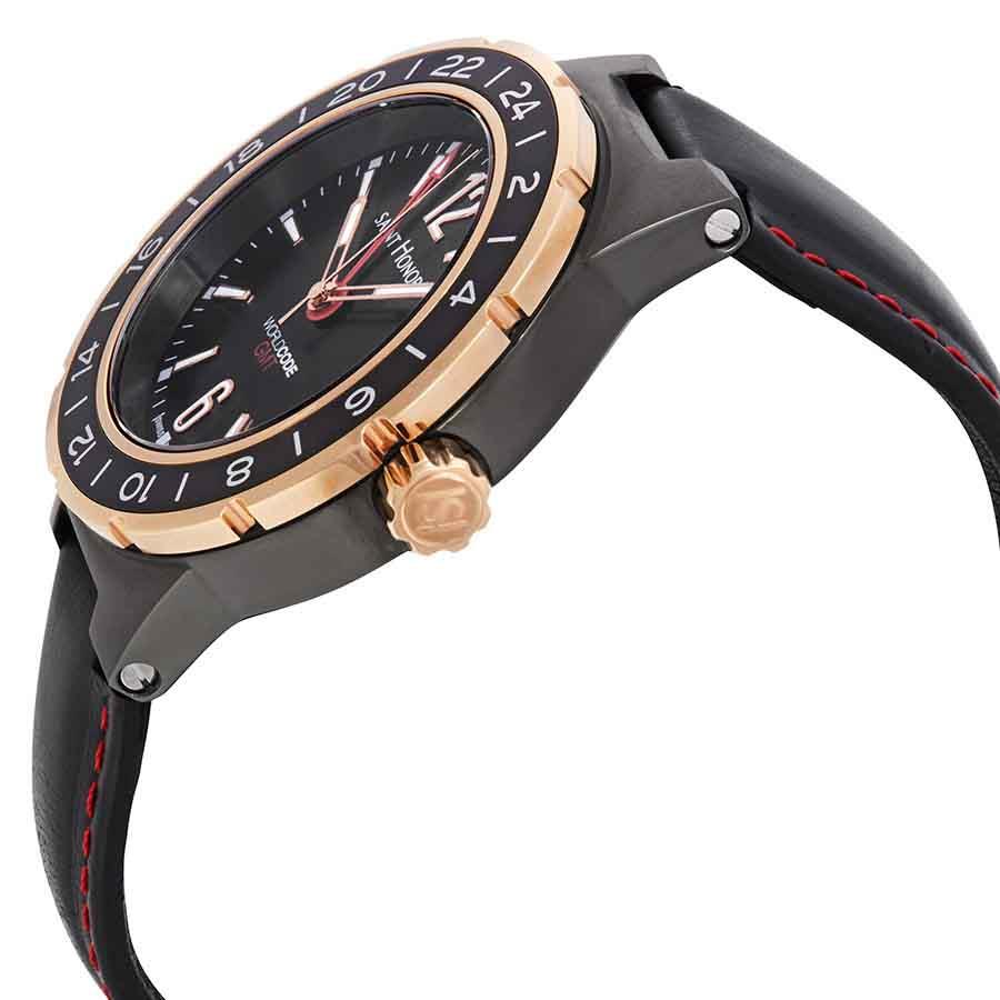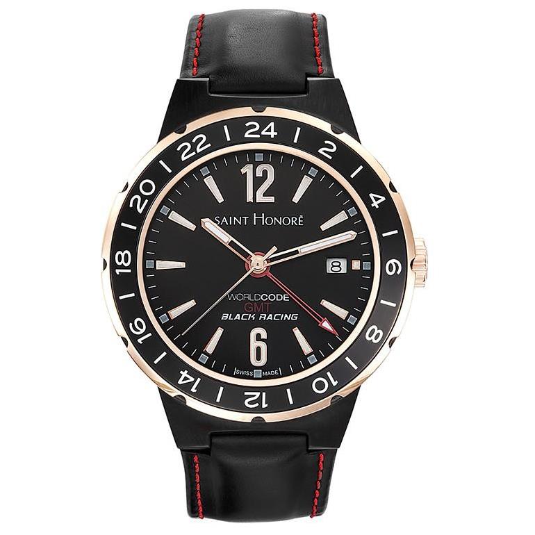 SAINT HONORE با طراحی روزانه بند چرم مشکی با قاب گرد دو رنگ مجهز به زه چرخان با صفحه مشکی و شیشه ضد خراش با موتور سوییسی و قابلیت تقویم,زمان دوم با انرژی باطری و مقاوم در برابر آب تا عمق 50 متر و از تولیدان محدود به 100 عدد در دنیا به همراه یک سال گارانتی شرکت نگین آرمان