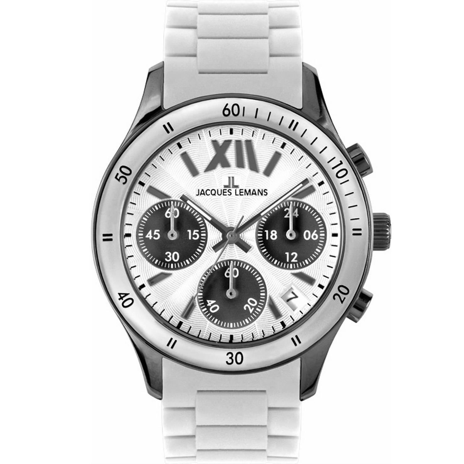 ساعت مچی زنانه/دخترانه ژاک لمن JACQUES LEMANSبا طراحی اسپرت بند رابر سفید رنگ و قاب گرد مشکی رنگ با موتور کرنوگراف از خانواده Rome Sports این ساعت مچی زنانه به همراه دو سال گارانتی بین المللی شرکت ژاک لمن ارائه میگردد