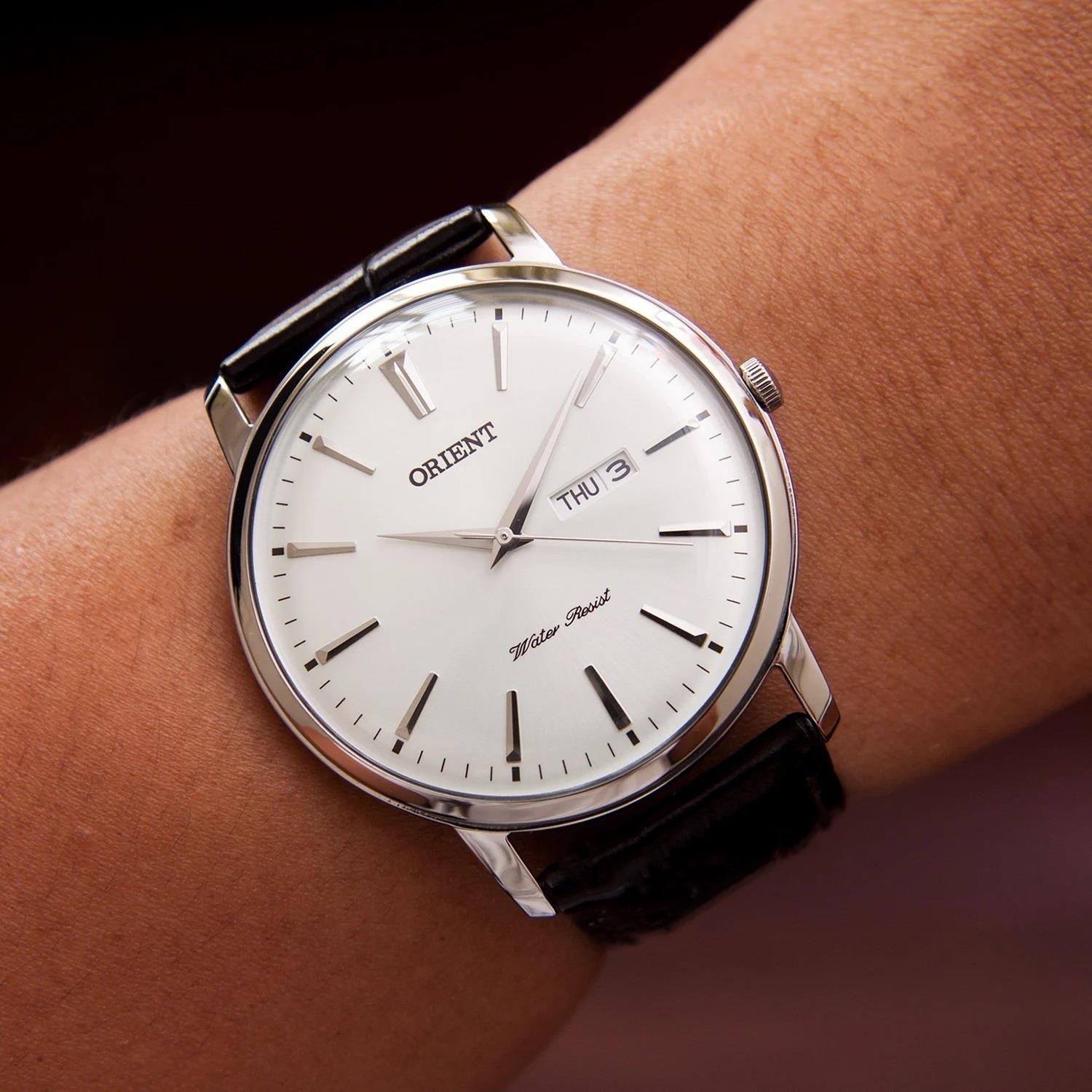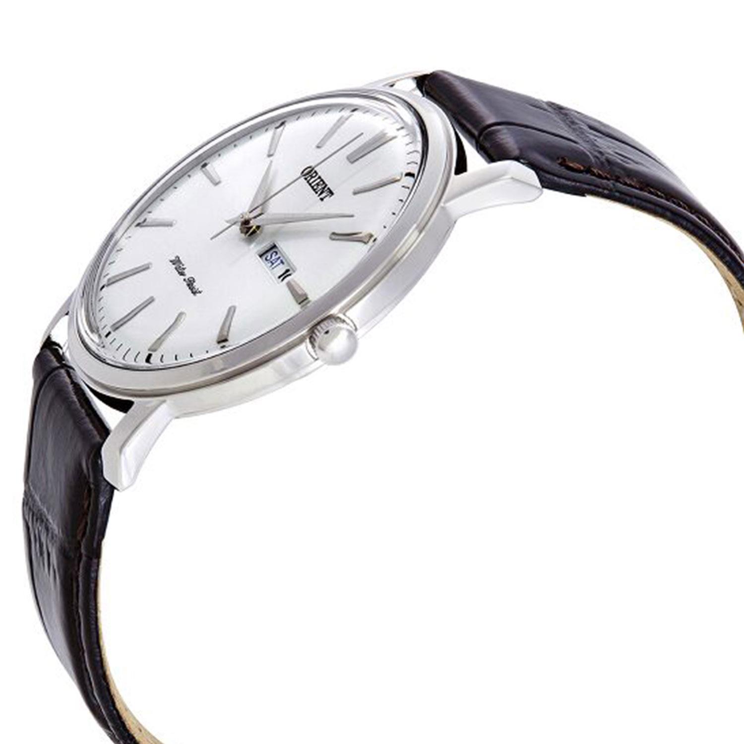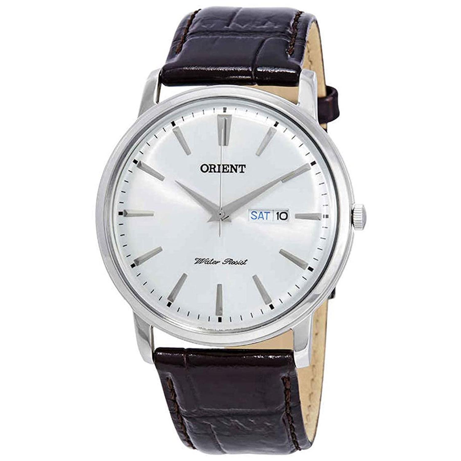 ORIENT ارینت با طراحی روزانه بند چرم قهوه ای با قاب گرد فلزی و شیشه محدب با صفحه نقره ای ساده و موتور ژاپنی با قابلیت تقویم روز و ماه با انرژی باطری و مقاوم در برابر آب تا عمق 30 متر به همراه دو سال گارانتی بین المللی شرکت آرمان گالری