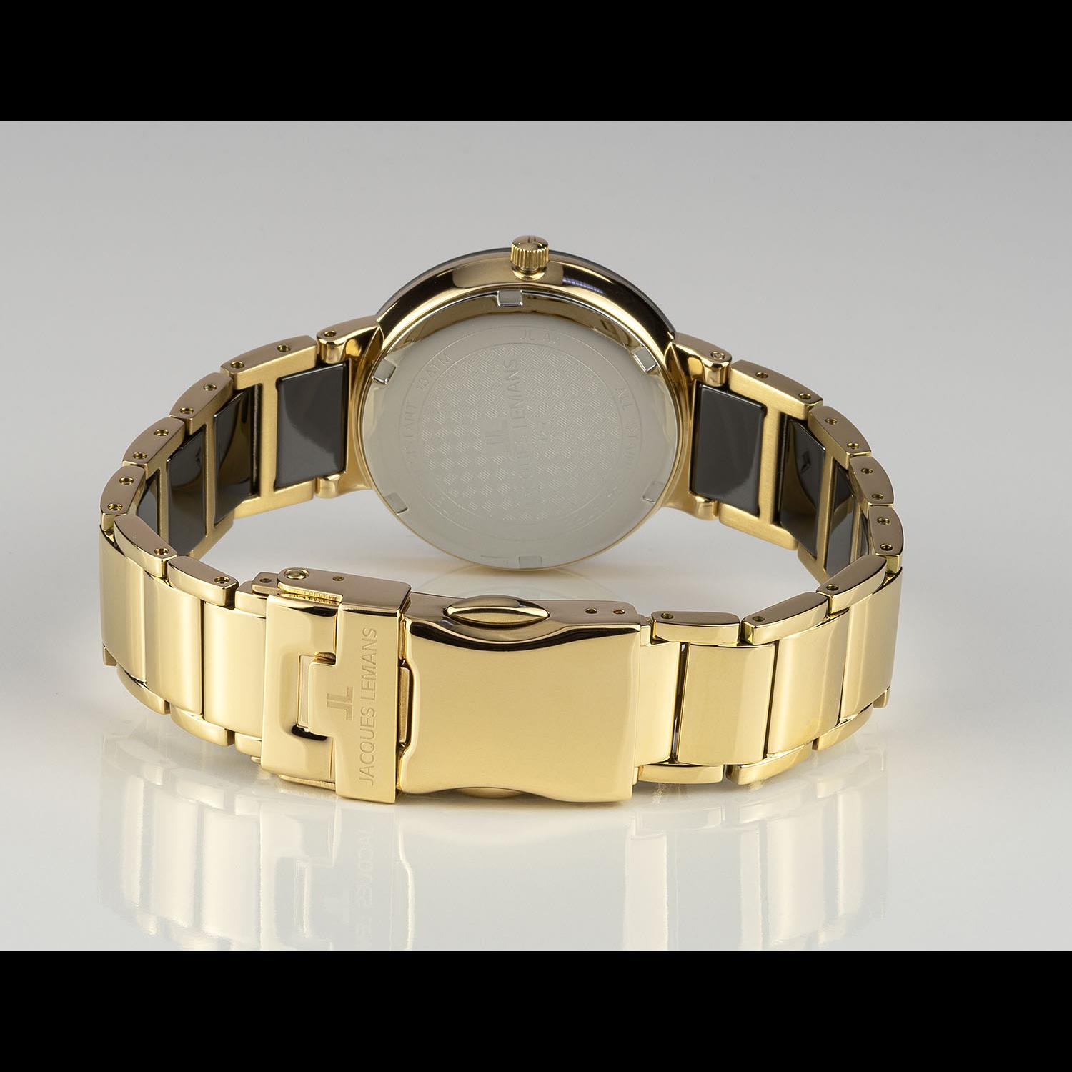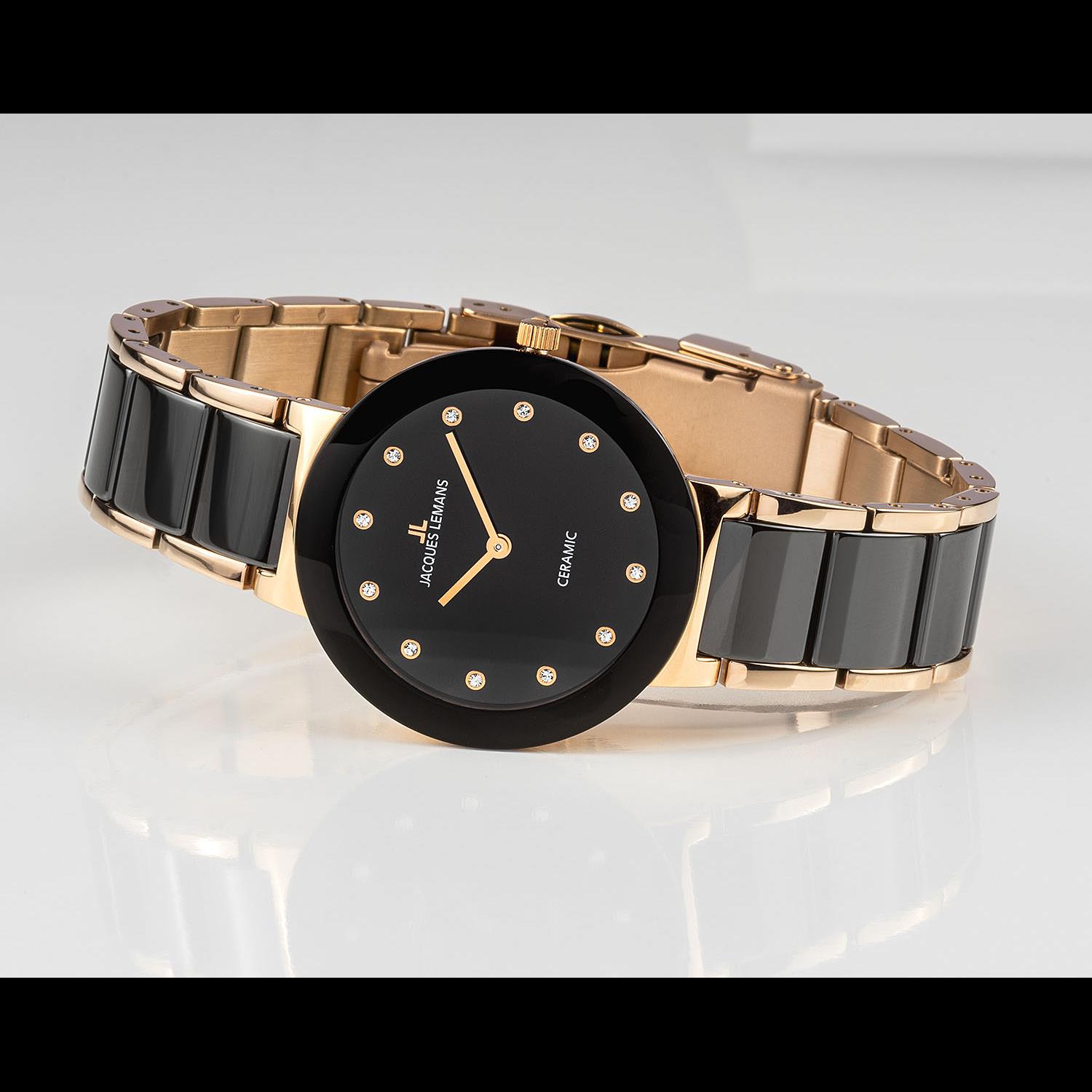 ساعت مچی زنانه/دخترانه ژاک لمن JACQUES LEMANSبا طراحی کلاسیک دو رنگ بند استیل/سرامیک با قاب گرد ظریف و صفحه مشکی مزین به نگین با موتور ژاپنی با انرژی باطری و مقاوم در برابر آب تا عمق 100 متر از خانواده MONACO این ساعت مچی زنانه  به همراه دو سال گارانتی بین المللی شرکت ژاک لمن ارائه میگردد