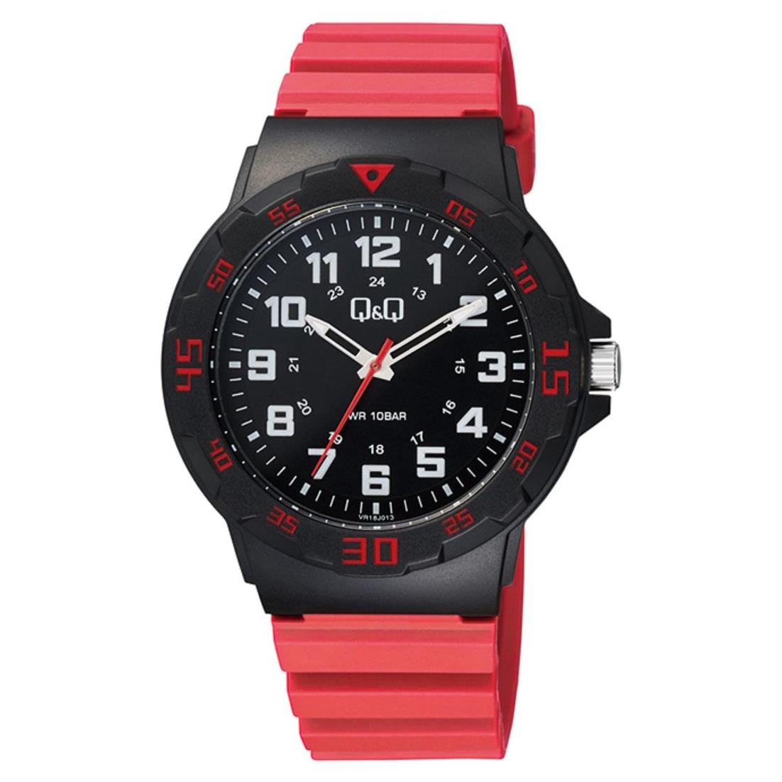 ساعت مچی مردانه/پسرانه کیو اند کیو QQ با طراحی روزانه بند سیلیکونی قرمز رنگ با قاب و صفحه گرد مشکی و موتور ژاپنی با انرژی باطری و مقاوم در برابر آب تا عمق 100 متراین ساعت مچی مردانه به همراه یک سال گارانتی شرکت بازرگانی زمان ارائه میگردد