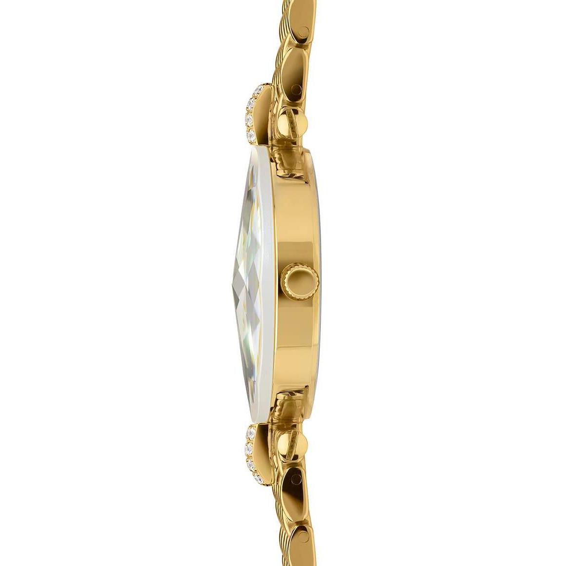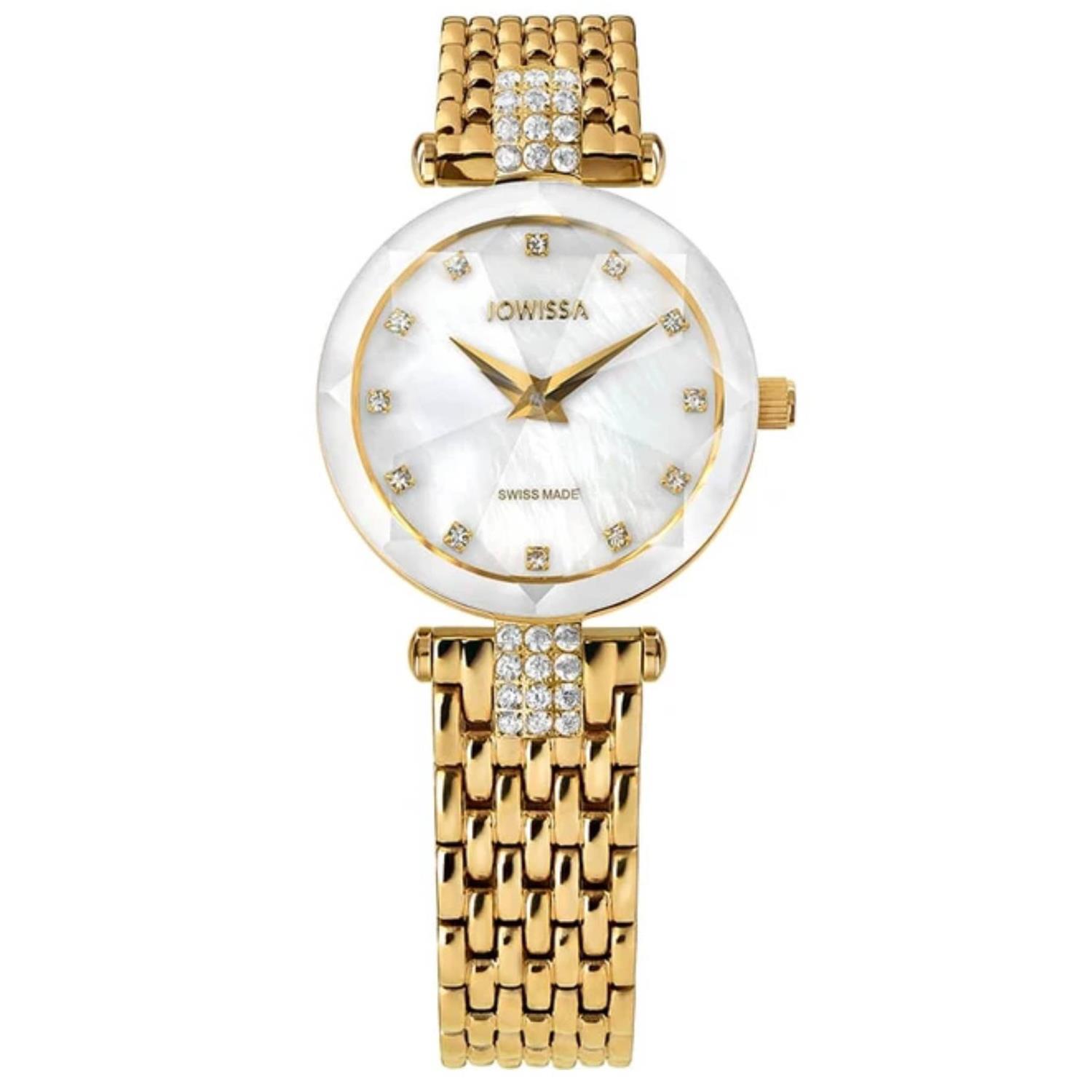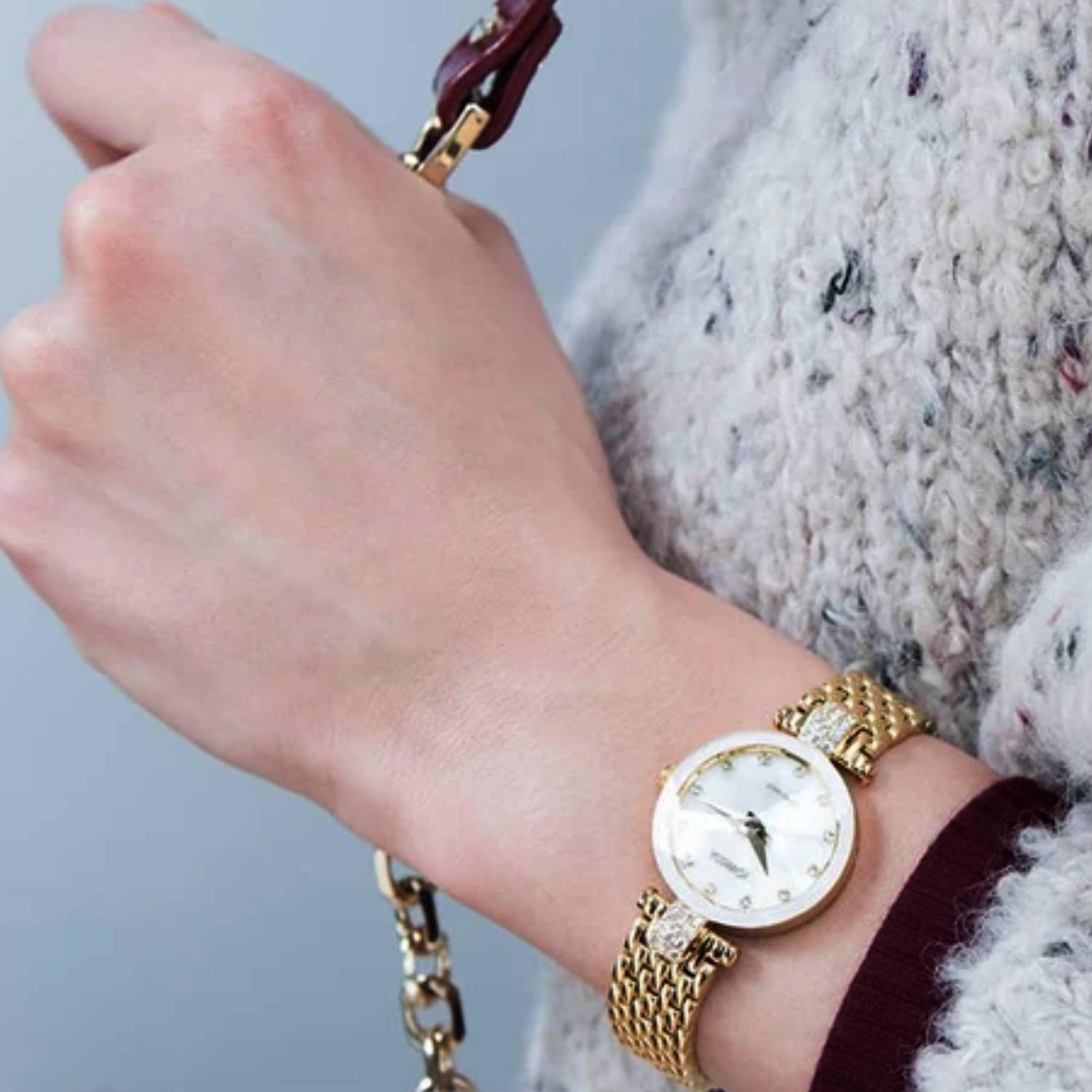 مجلسی طلایی رنگ بند فلزی با قاب گرد و صفحه سفید صدفی مزین به نگین با شیشه تراش خورده و موتور سوییسی با انرژی باطری و مقاوم در برابر آب تا عمق 50 متر به همراه دو سال گارانتی بین المللی شرکت زمردیان