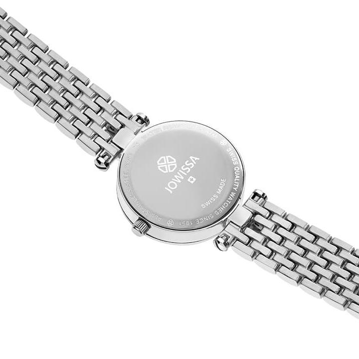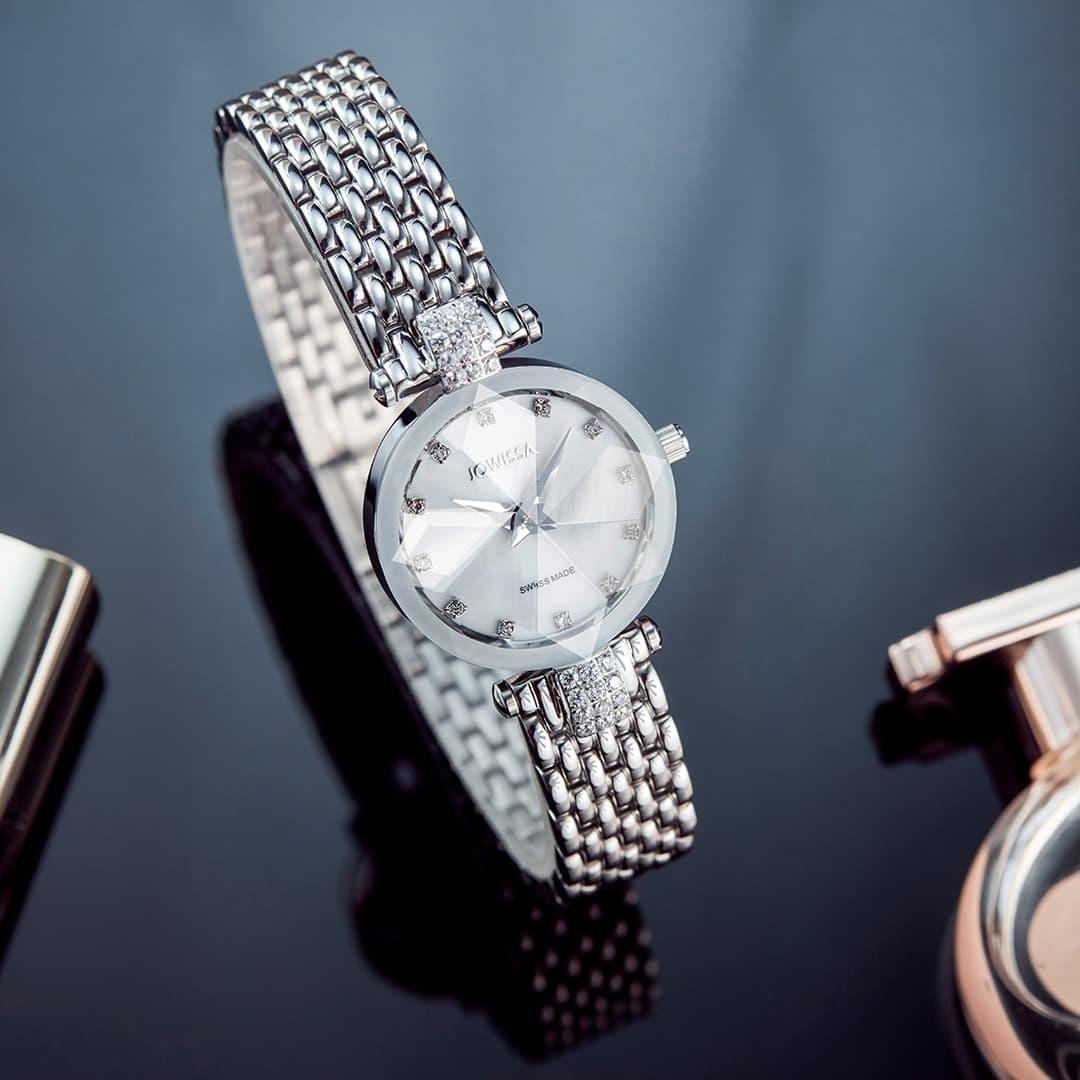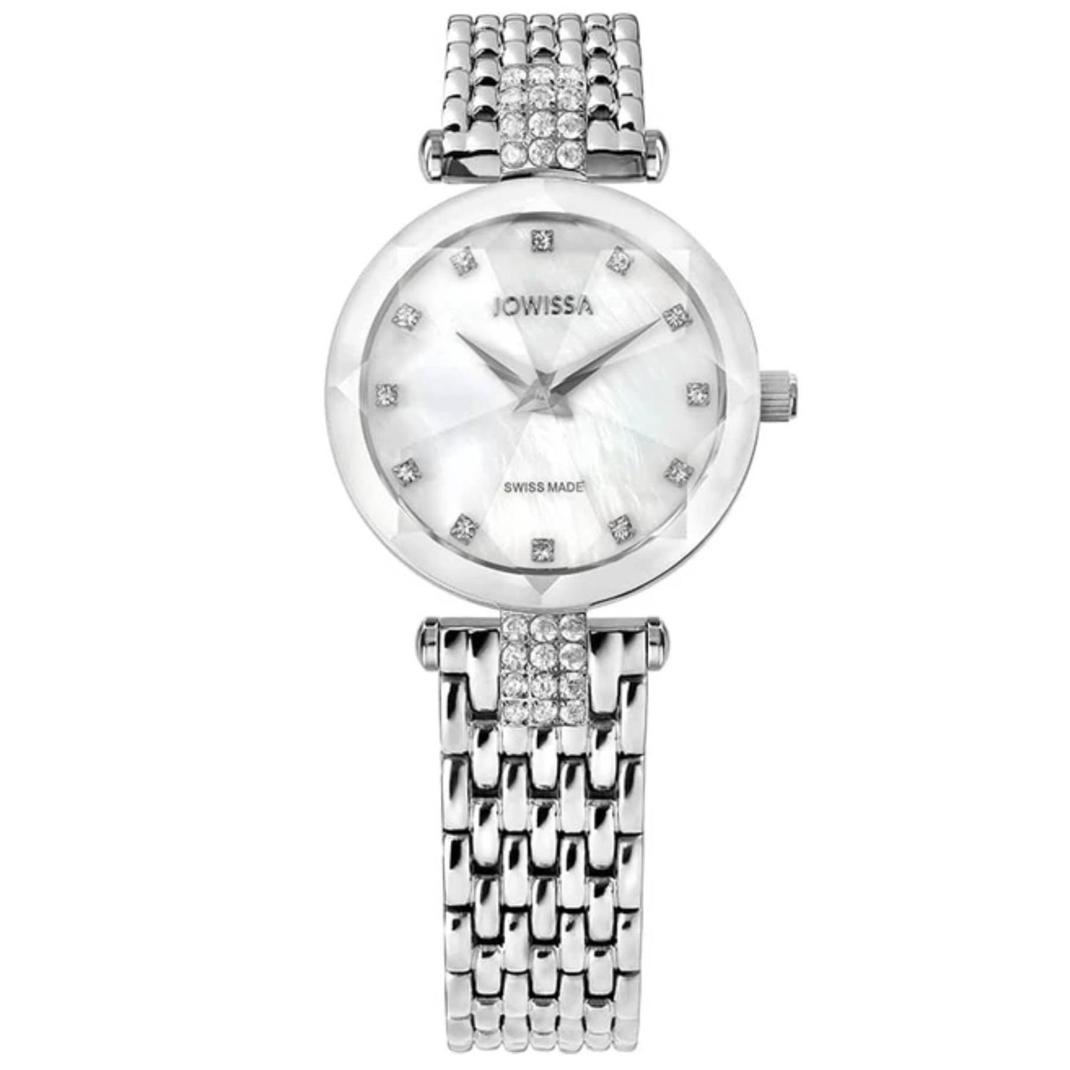 JOWISSA با طراحی روزانه بند فلزی با قاب گرد و صفحه سفید صدفی مزین به نگین با شیشه تراش خورده و موتور سوییسی با انرژی باطری و مقاوم در برابر آب تا عمق 50 متر به همراه دو سال گارانتی بین المللی شرکت زمردیان