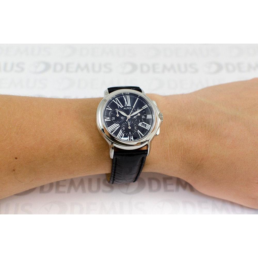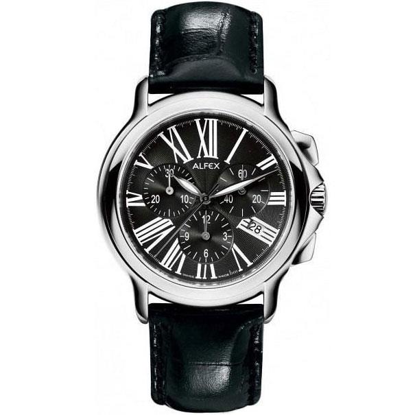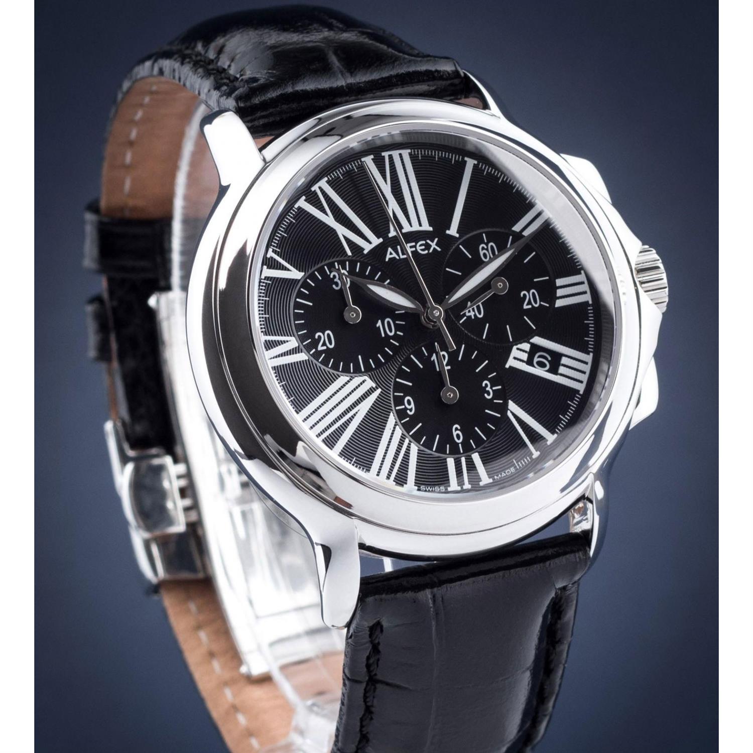 ساعت مچی مردانه الفکس ALFEX با طراحی روزانه بند چرم مشکی مجهز به قفل کلیپسی با قاب گرد فلزی و صفحه مشکی با درج اعداد یونانی و شیشه ضدخراش و موتور سوییسی با قابلیت تقویم ,کرنومتر با انرژی باطری و مقاوم در برابر آب تا عمق 50 متر به همراه دو سال گارانتی بین المللی شرکت الفکس