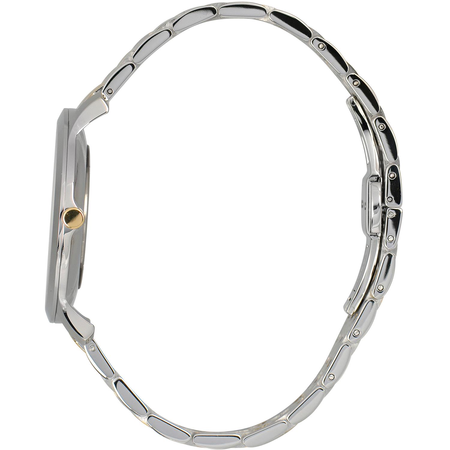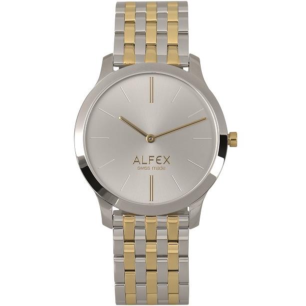 ساعت مچی مردانه الفکس ALFEX با طراحی مجلسی دو رنگ بند فلزی با قاب گرد نازک و صفحه نقره ای با شیشه ضدخراش و موتور سوییسی با انرژی باطری و مقاوم در برابر آب تا عمق 30 متر به همراه دو سال گارانتی بین المللی شرکت الفکس