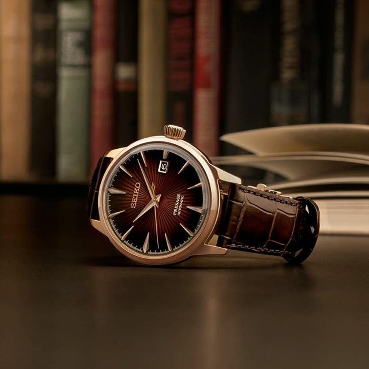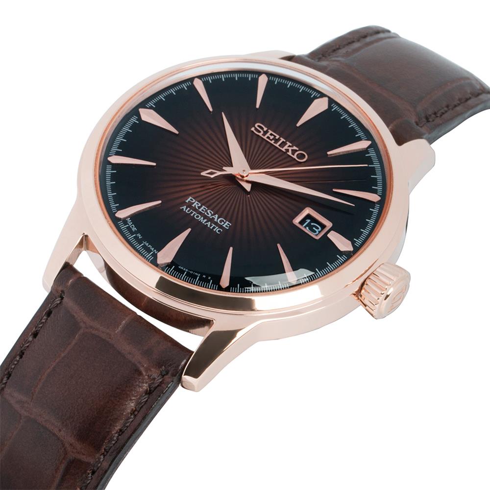 ساعت مچی مردانه سیکو SEIKO با طراحی روزانه بند چرم قهوه ای با قاب گرد رزگلد و صفحه قهوه ای با موتور اتوماتیم ژاپنی با قابلیت تقویم و انرژی مکانیکی و مقاوم در برابر آب تا عمق 50 متر این ساعت مچی مردانه به همراه دو سال گارانتی بین المللی ارائه میگردد