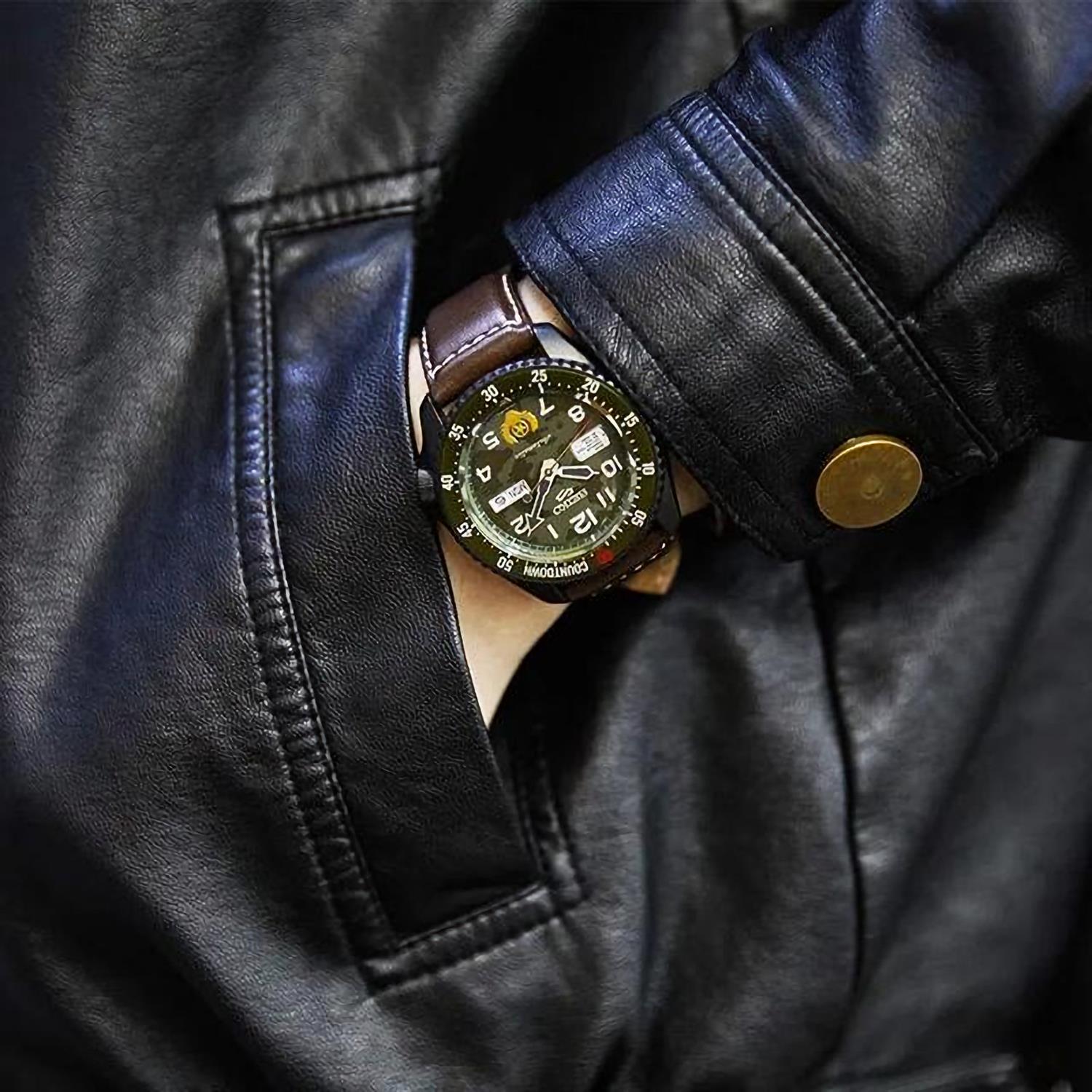 ساعت مچی مردانه سیکو SEIKO با طراحی اسپرت بند چرم قهوه ای با قاب گرد دو رنگ و صفحه سبز ارتشی با موتور اتوماتیک ژاپنی و قابلیت تقویم روز و ماه با انرژی مکانیکی و مقاوم در برابر آب تا عمق 100 متراین ساعت مچی مردانه به همراه دو سال گارانتی بین المللی ارائه میگردد