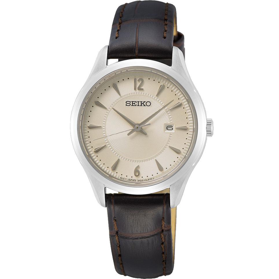 ساعت مچی زنانه سیکو SEIKO با طراحی روزانه بند چرم قهوه ای با قاب گرد فلزی صفحه کرم با شیشه ضدخراش و موتور ژاپنی با قابلیت تقویم و انرژی باطری و مقاوم در برابر آب تا عمق 100 متر این ساعت مچی زنانه به همراه دو سال گارانتی بین المللی ارائه میگردد