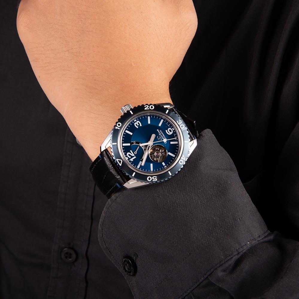ساعت مچی مردانه/پسرانه ORIENT ارینت با طراحی روزانه بند چرم مشکی با قاب گرد دو رنگ مجهز به زه چرخان و صفحه سرمه ای قلب باز با شیشه ضدخراش و موتور اتوماتیک ژاپنی با قابلیت شاخص ذخیره انرژی با انرژی مکانیکی و مقاوم در برابر آب تا عمق 200 متر به همراه دو سال گارانتی بین المللی
