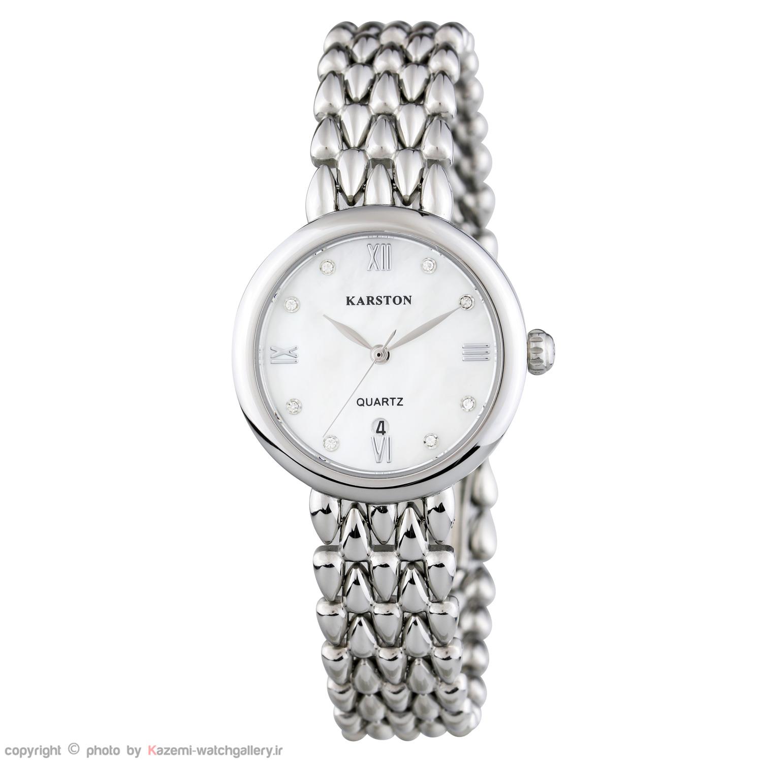 ساعت مچی زنانه کارستون  KARSTON با طراحی روزانه بند فلزی با قاب گرد و صفحه سفید صدفی مزین به نگین با موتور ژاپنی و قابلیت تقویم و انرژی باطری و مقاوم در برابر آب تا عمق 30 متر به همراه دو سال گارانتی شرکت کارستون
