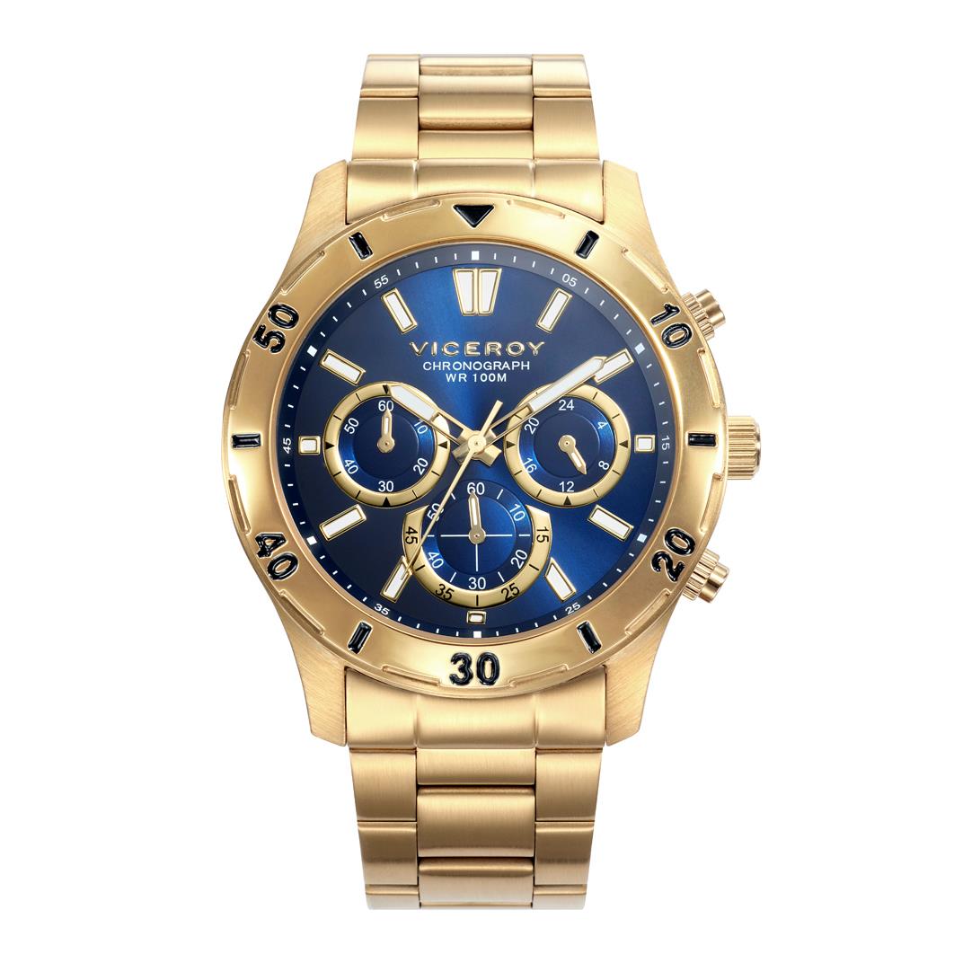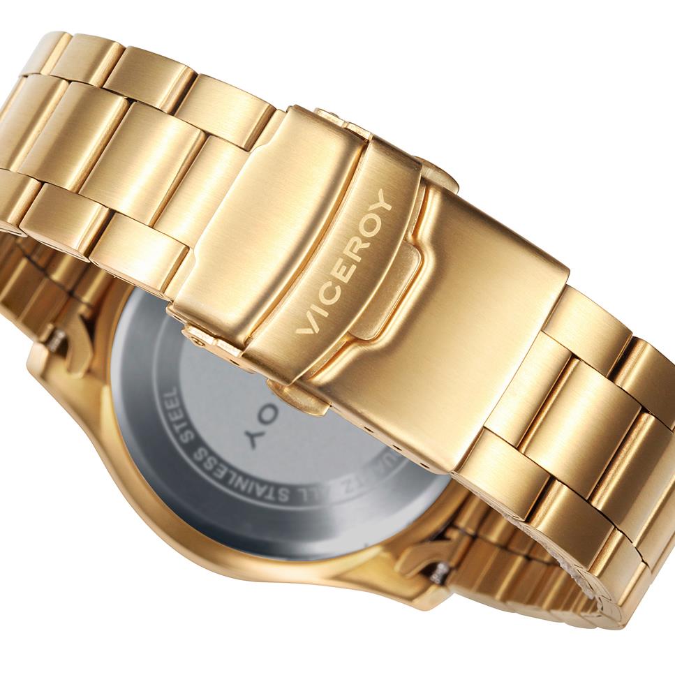 ساعت مچی مردانه ویزروی VICEROY با طراحی روزانه طلایی رنگ بند فلزی با قاب گرد و صفحه سرمه ای با موتور ژاپنی با قابلیت کرنومتر و انرژی باطری و مقاوم در برابر آب تا عمق 100 متراین ساعت مچی به همراه دو سال گارانتی بین المللی شرکت جام جم ارائه میگردد