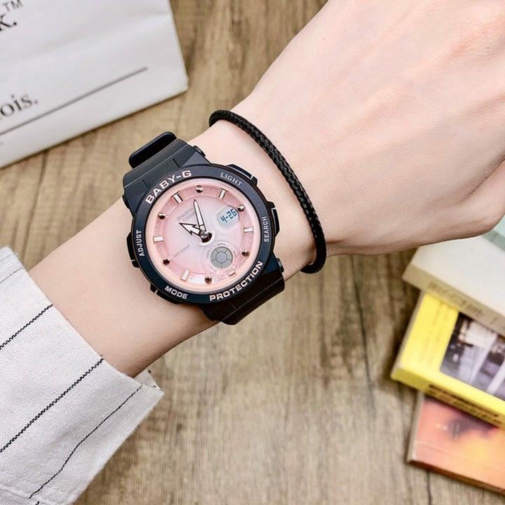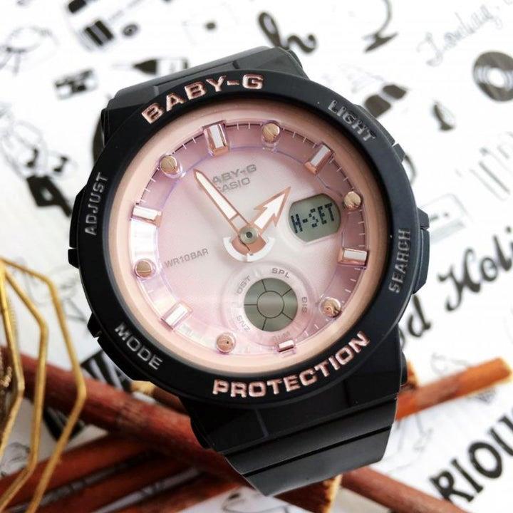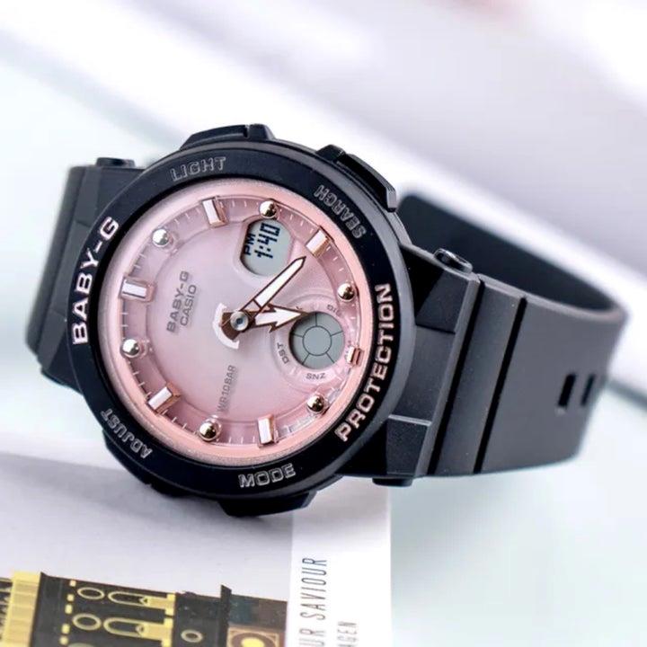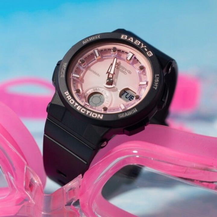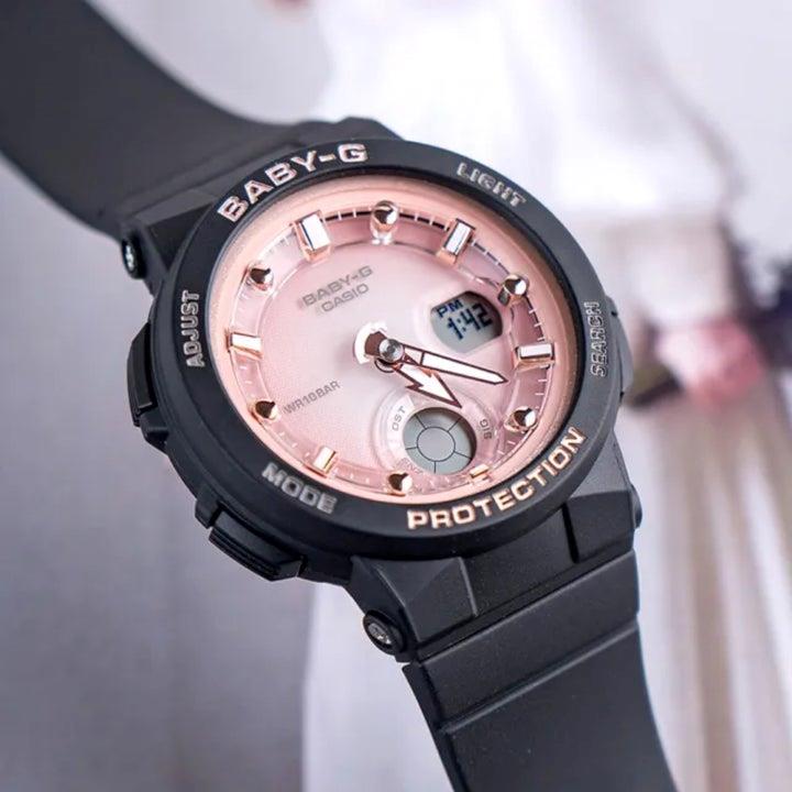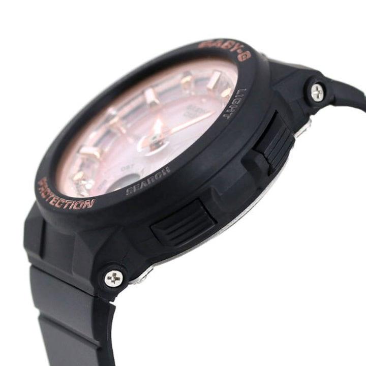ساعت مچی زنانه/دخترانه کاسیو CASIO با طراحی اسپرت بند سیلیکونی مشکی با قاب گرد مشکی و صفحه رزگلد با نمایشگر دیجیتال/آنالوگ و موتور ژاپنی با قابلیت تقویم روز و ماه,کرنومتر,تایمر شمارش معکوس,نور پشت صفحه,آلارم,ساعت کشورها با انرژی باطری و مقاوم در برابر آب تا عمق 100 متر مناسب برای ورزشهای آبی از خانواده Baby-g این ساعت مچی زنانه به همراه یک سال گارانتی بین المللی شرکت پارس ارائه میگردد