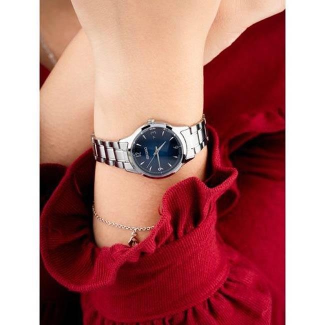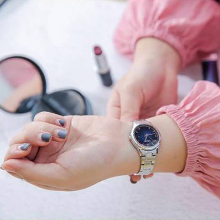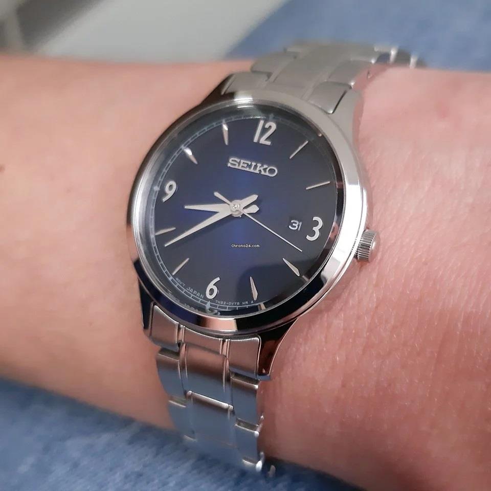 ساعت مچی زنانه سیکو SEIKO با طراحی روزانه بند فلزی با قاب گرد فلزی و صفحه سرمه ای با موتور ژاپنی و قابلیت تقویم و انرژی باطری و مقاوم در برابر آب تا عمق 100 متر به همراه دو سال گارانتی بین المللی
