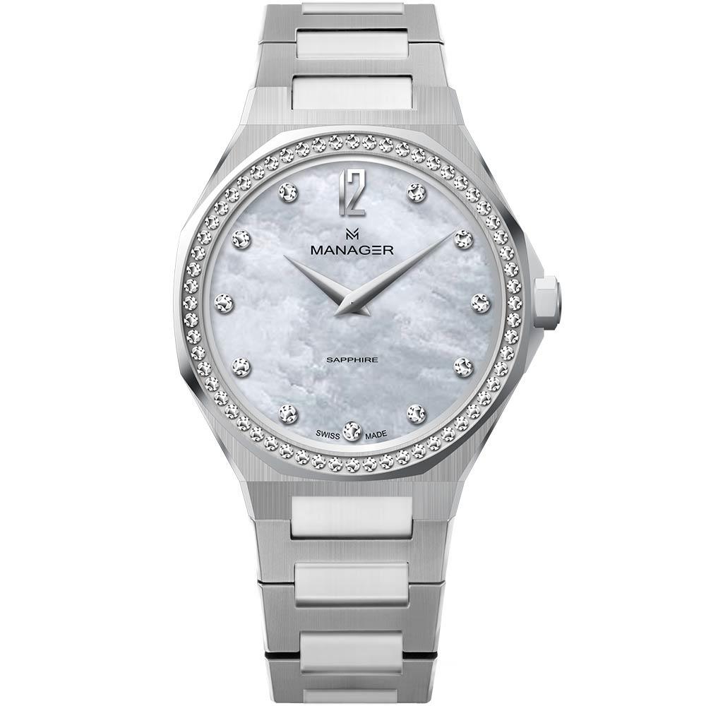ساعت مچی زنانه منیجر MANAGER با طراحی مجلسی بند فلزی با قاب گرد دور نگین و صفحه سفید صدفی مزین به نگین سواروسکی با شیشه ضدخراش و موتور سوییسی با انرژی باطری و مقاوم در برابر آب تا عمق 50 متر به همراه دو سال گارانتی بین المللی بازرگانی زمردیان