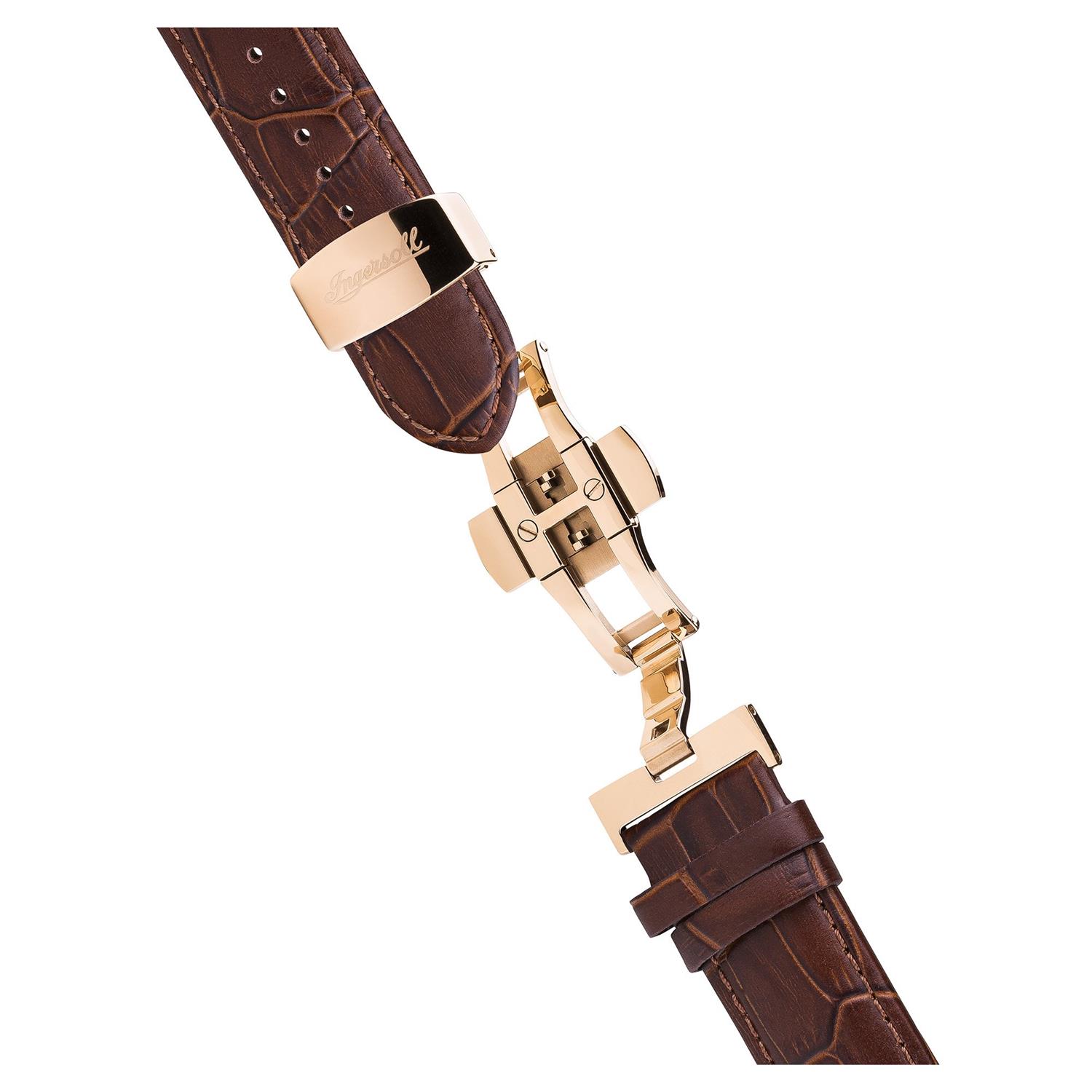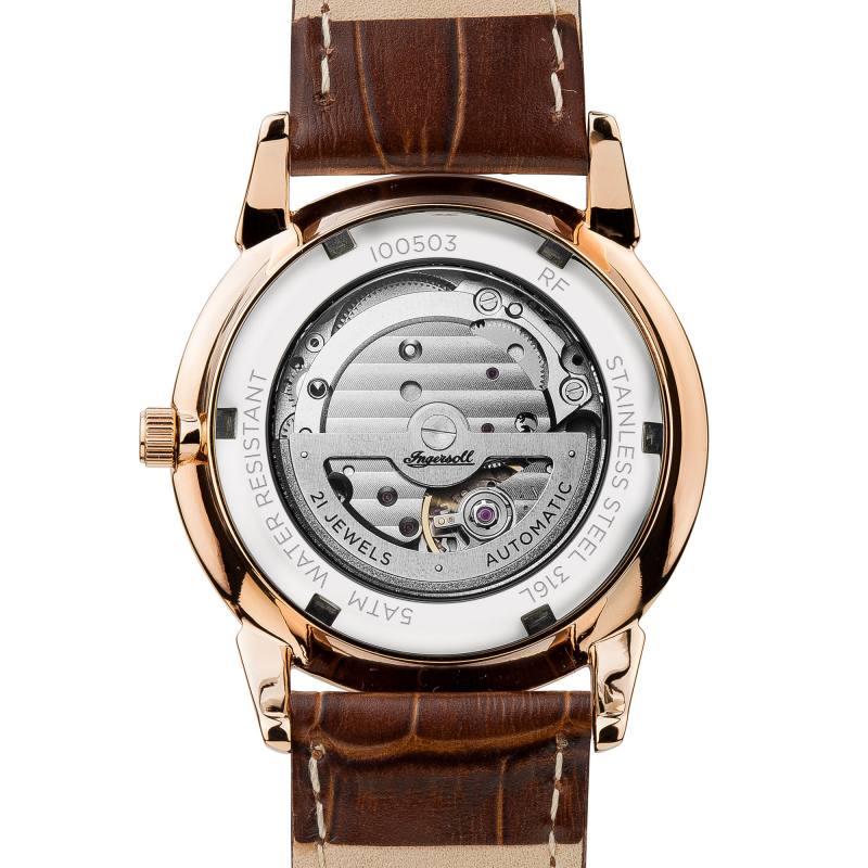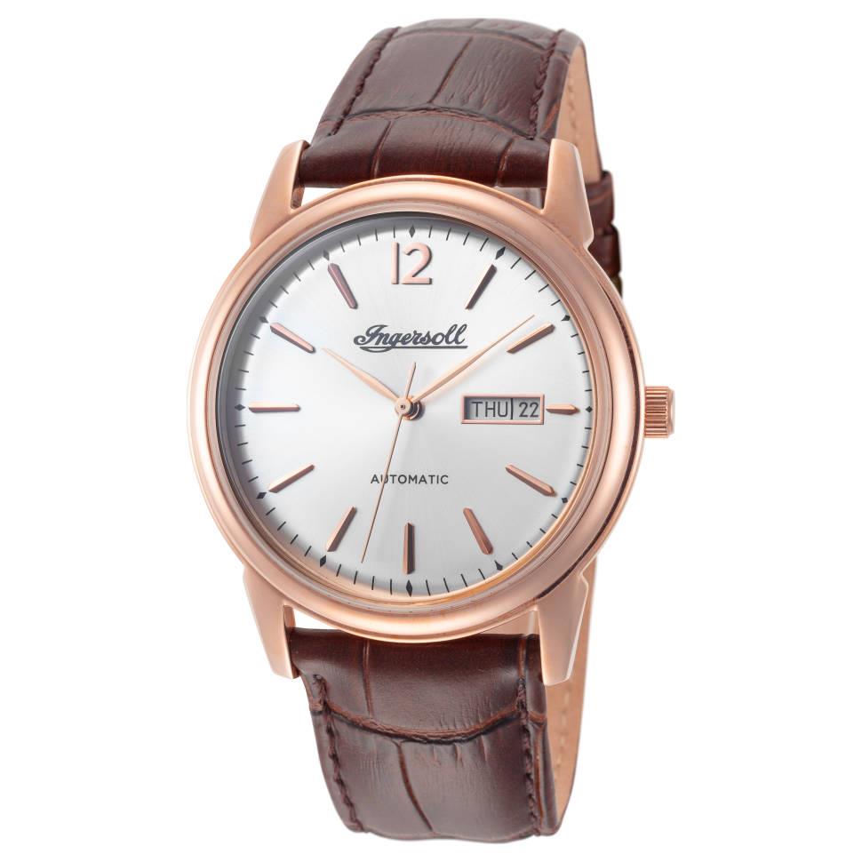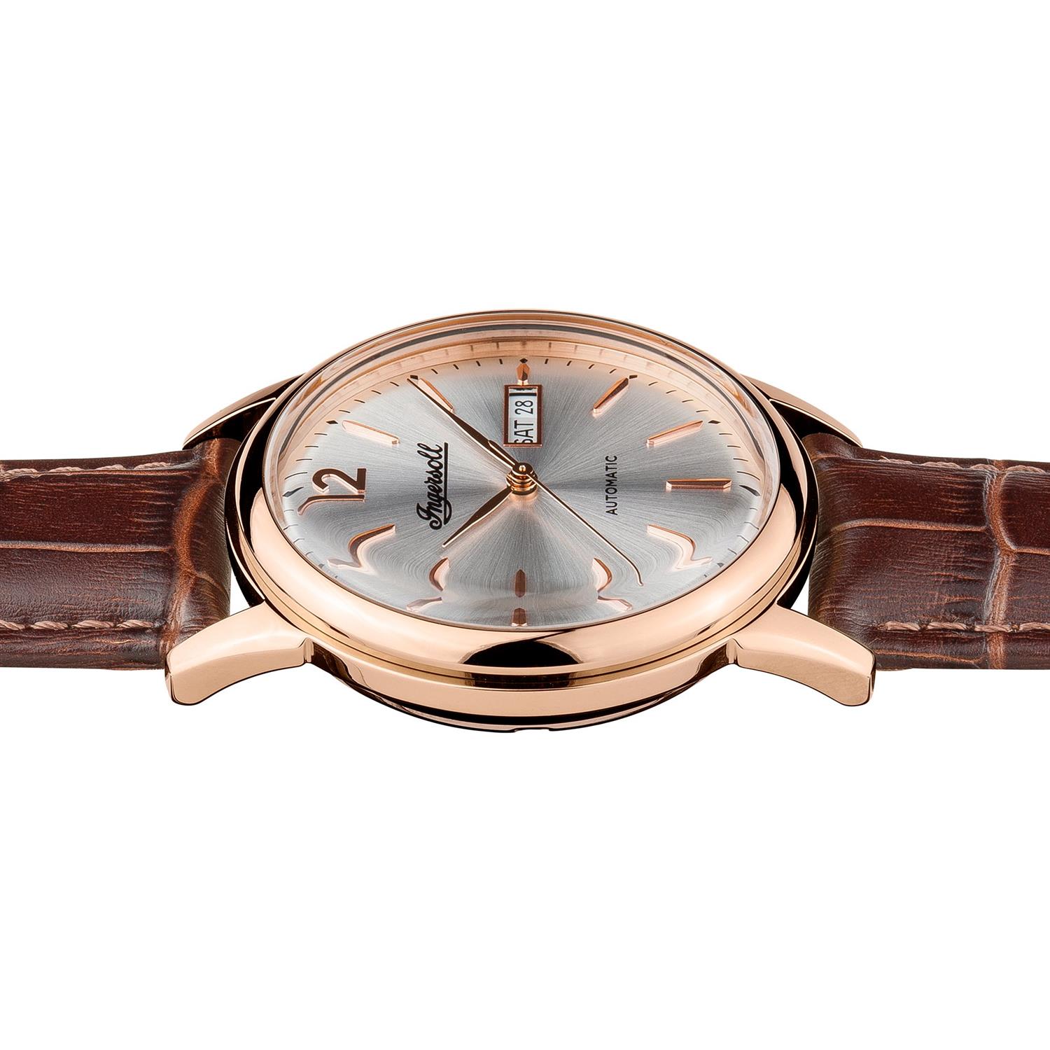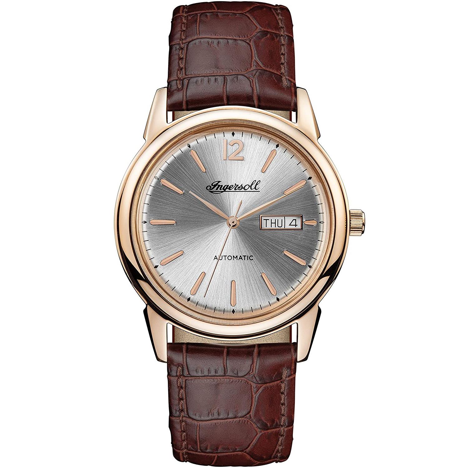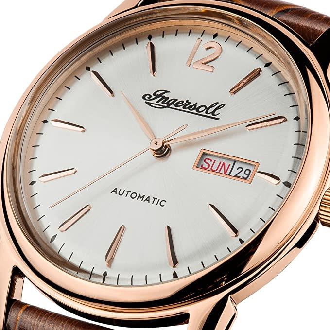ساعت مچی مردانه اینگرسول INGERSOL با طراحی کلاسیک بند چرم قهوه ای با قاب گرد رزگلد و صفحه نقره ای با موتور اتوماتیک ژاپنی و قابلیت تقویم روز و ماه با انرژی مکانیکی و مقاوم در برابر آب تا عمق 50 متر به همراه دو سال گارانتی مادام العمر بین المللی