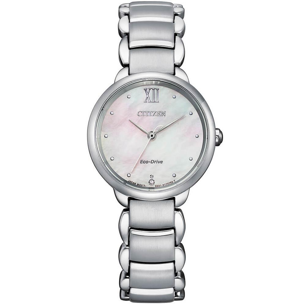 ساعت مچی زنانه سیتی زن CITIZEN با طراحی روزانه بند فلزی با قاب گرد و صفحه سفید صدفی و شیشه ضدخراش با موتور اکودرایو ژاپنی با انرژی نوری و مقاوم در برابر آب تا عمق 50 متر به همراه دو سال گارانتی بین المللی