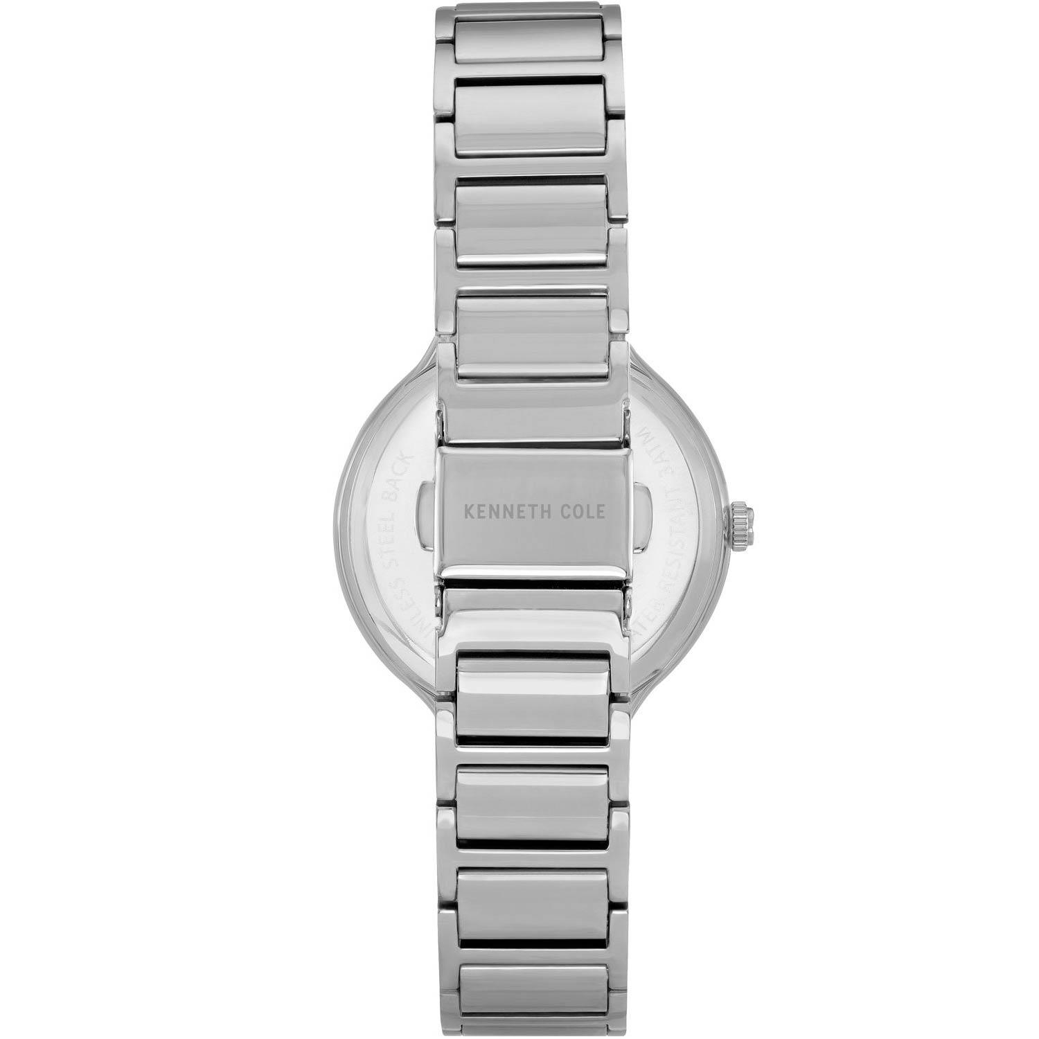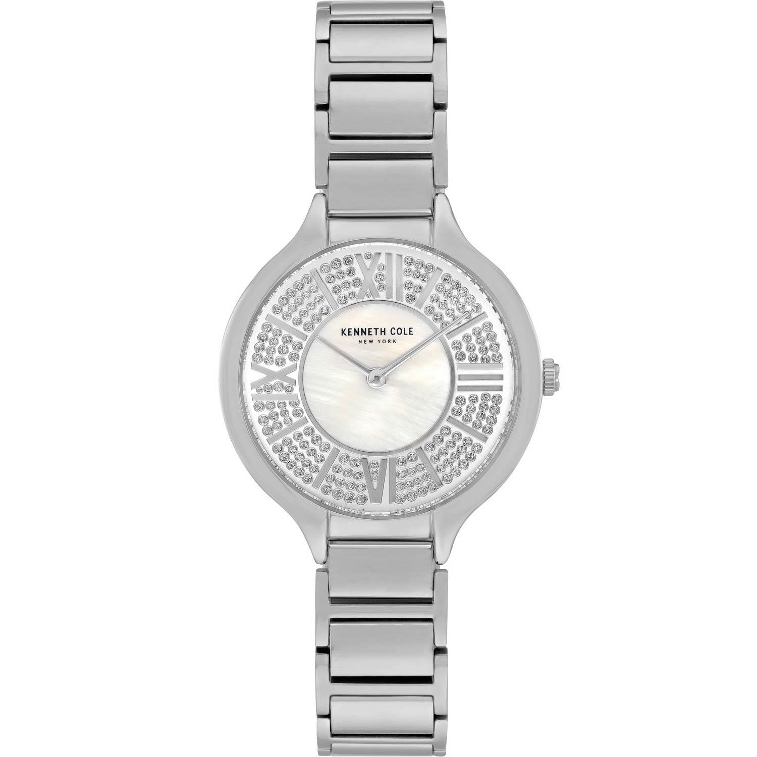 ساعت مچی زنانه کنت کول KENNETH COLE با طراحی مجلسی بند فلزی با قاب گرد و صفحه سفید صدفی مزین به نگین با موتور ژاپنی و انرژی باطری و مقاوم در برابر آب تا عمق 30 متر به همراه دو سال گارانتی بین المللی