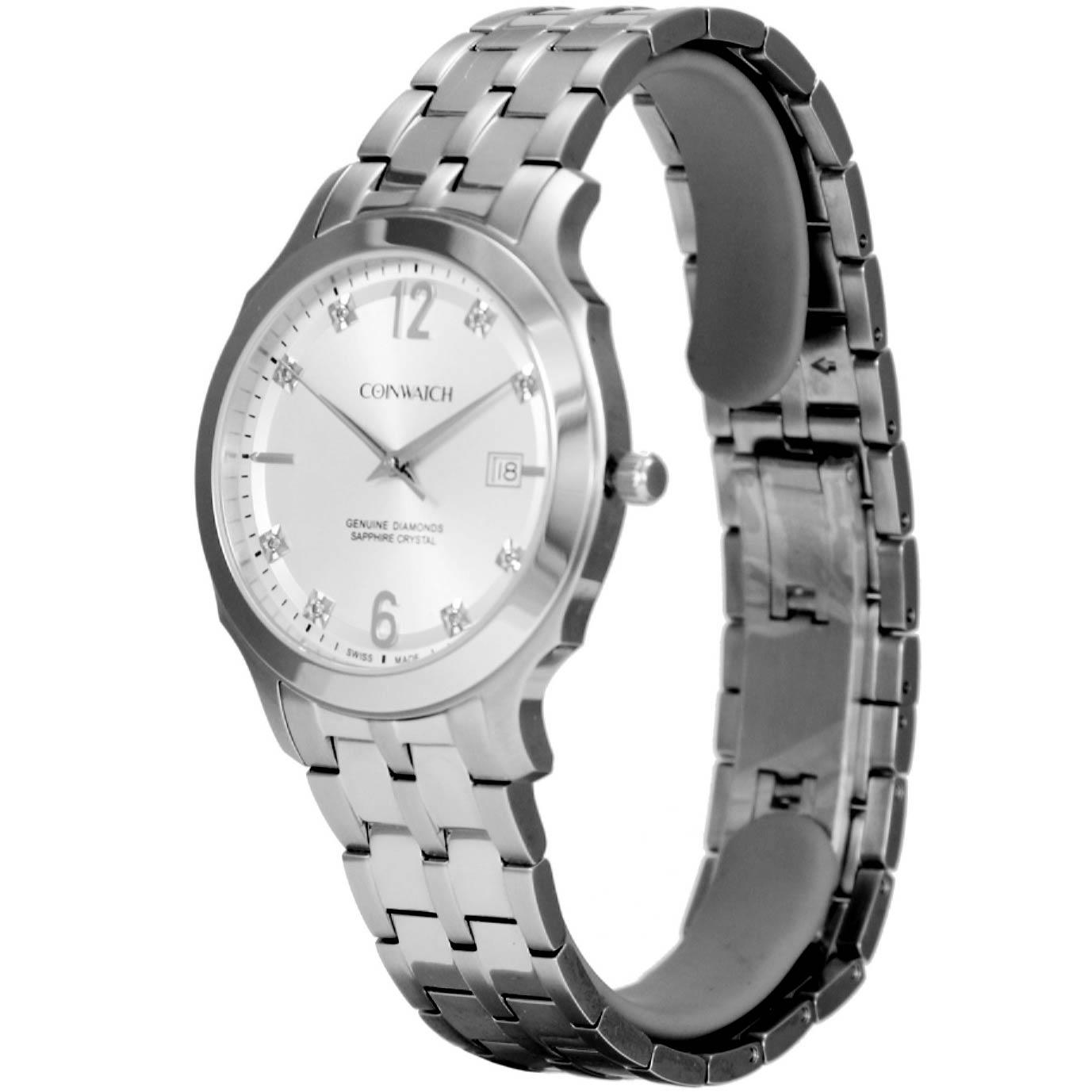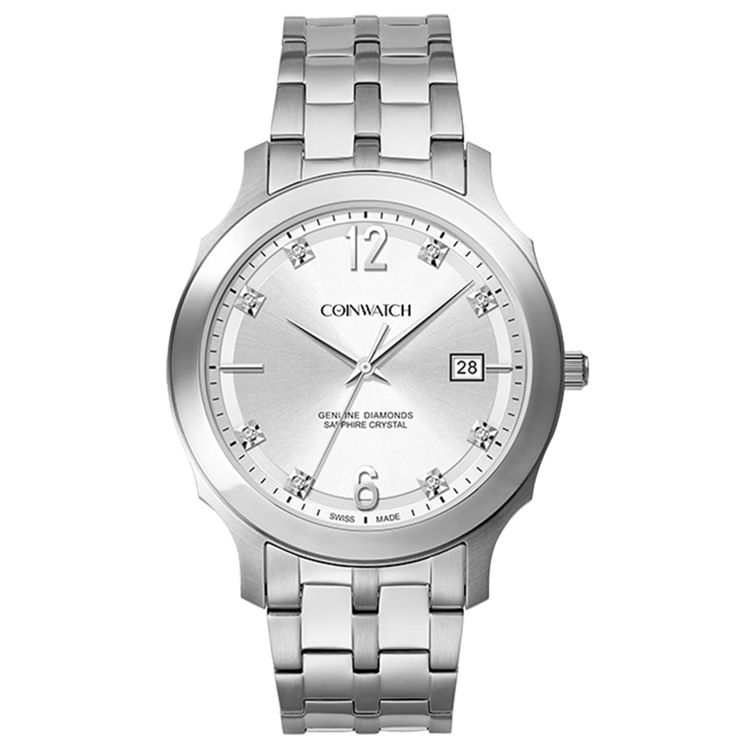 ساعت مچی مردانه کوین واچ coinwatch با طراحی کلاسیک بند وقاب استیل با صفحه نقره ای مزین با نگین برلیان وشیشه ضد خراش با قابلیت داشتن تقویم شب نما وموتور کوارتز سوئیسی با مقاومت در برابر اب تا عمق50 متر با دو سال گارانتی بین المللی