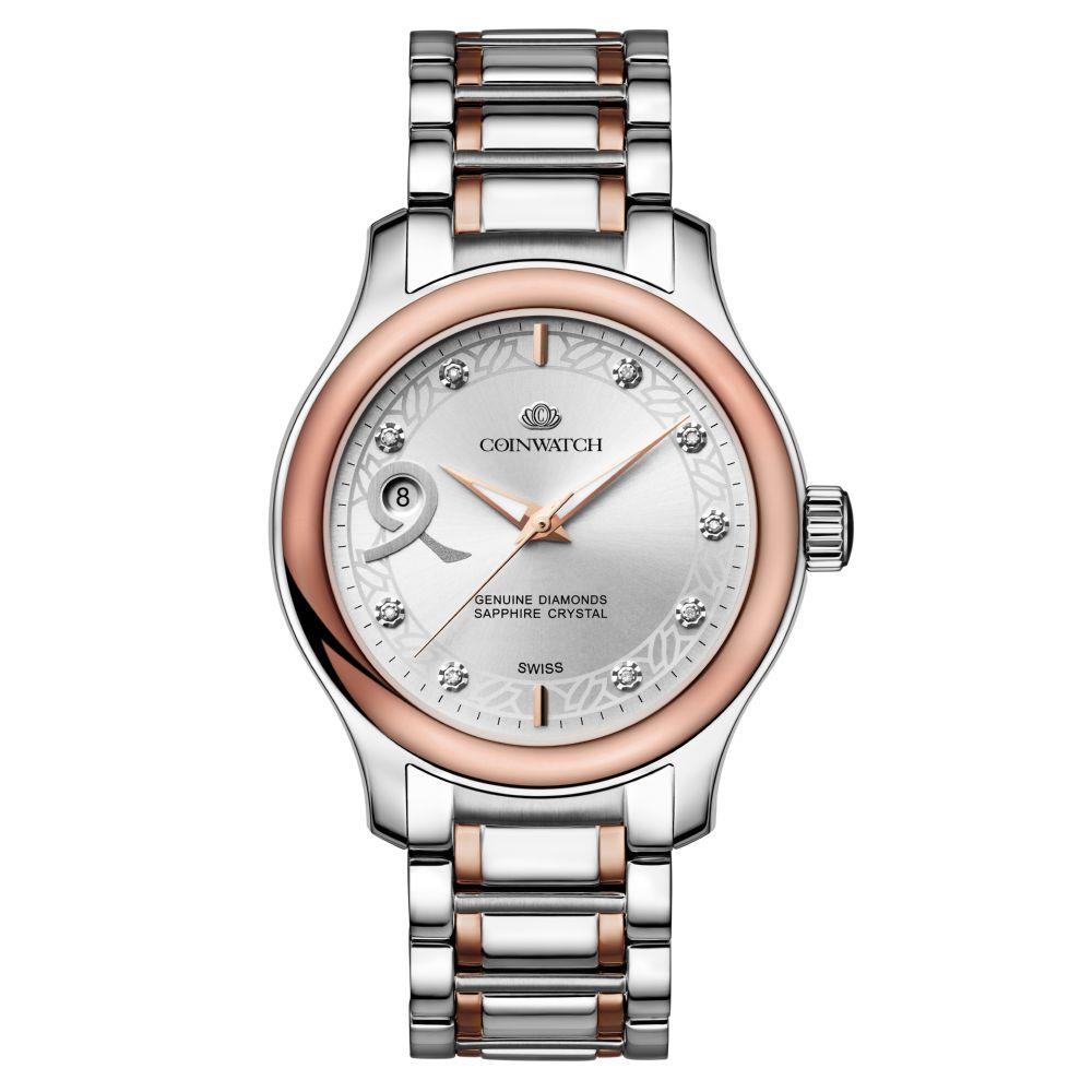 ساعت مچی مردانه کوین واچ coinwatch با طراحی کلاسیک بند و قاب دو رنگ مسی استیل وصفحه نقره ای مزین با نگین برلیان و شیشه ضد خراش وقابلیت داشتن تقویم شب نما وموتورسوئیسی با انرژی باتری ومقاومت در برابر اب تا عمق 30متربه همراه دو سال گارانتی بین المللی