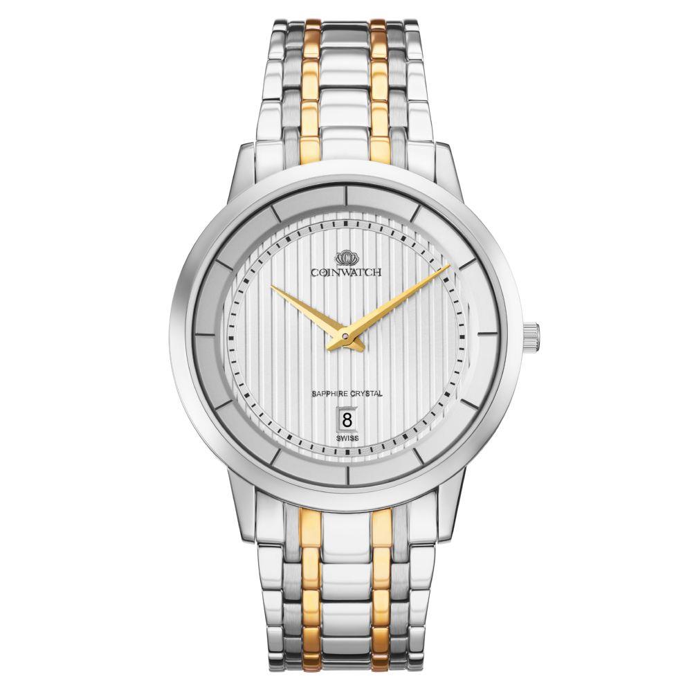 ساعت مچی مردانه کوین واچcoinwatch با طراحی کلاسیک و بند فلزی دو رنگ استیل طلایی و قاب استیل و شیشه ضد خراش با قابلیت داشتن تقویم وصفحه نقره ای و موتور سوئیسی با انرژی باتری و قابلیت مقاومت در برابر آب تا عمق 30 متر به همراه دو سال گارانتی بین المللی ارائه میگردد