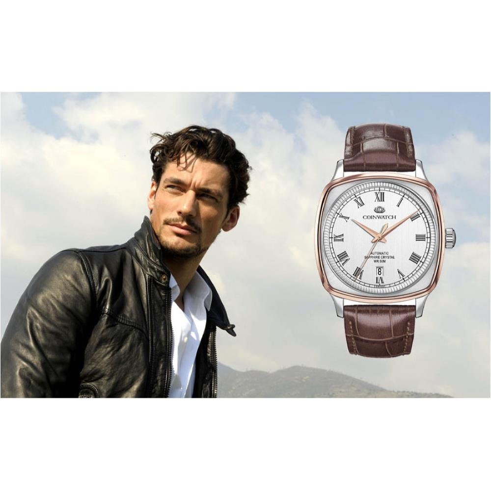 ساعت مچی مردانه کوین واچ coinwatch با طراحی کلاسیک بند چرمی قهوه ای و قاب مربع دو رنگ و شیشه ضد خراش و قابلیت داشتن تقویم و موتور سوئیسی ومقاومت در برابر اب تا عمق 50 متر به همراه دو سال گارانتی بین المللی ارائه میگردد