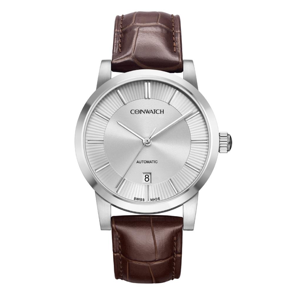 ساعت مچی مردانه کوین واچ coinwatch با طراحی کلاسیک و بند چرم قهوه ای و قاب گرد استیل و صفحه گرد نقره ای رنگ و شیشه ضد خراش با موتور اتوماتیک سوئیسی وقابلیت تقویم و مقاومت در برابر اب تا عمق50 متر به همراه دو سال گارانتی بین المللی ارائه میگردد