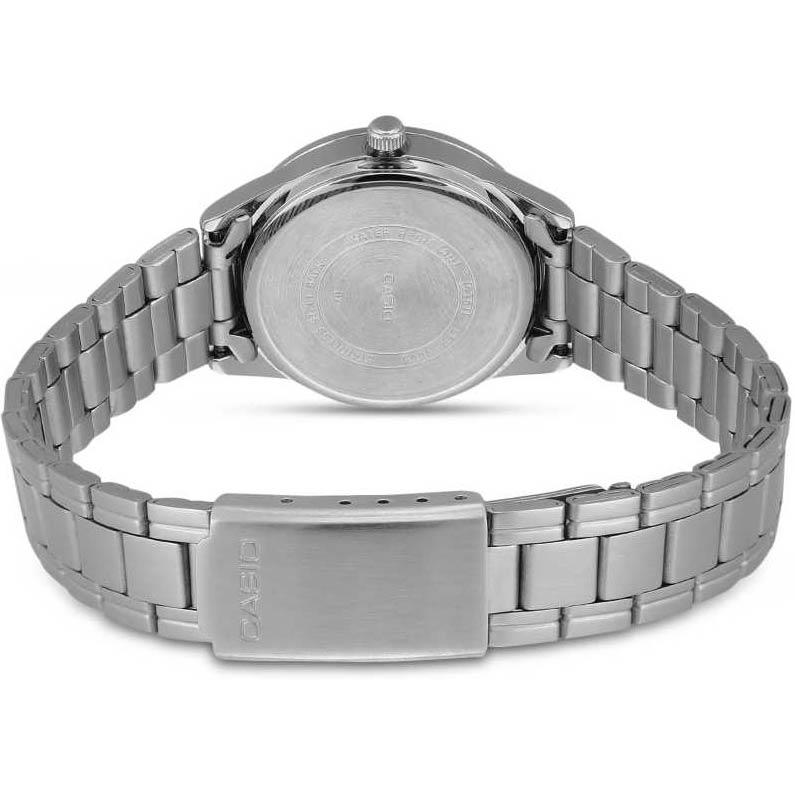 ساعت مچی زنانه/دخترانه کاسیو CASIO با طراحی کلاسیک بند فلزی با قاب گرد و صفحه سرمه ای با موتور ژاپنی و انرژی باطری و مقاوم در برابر آب تا عمق 30 متر از خانواده Dress به همراه یک سال گارانتی بین المللی شرکت پارس