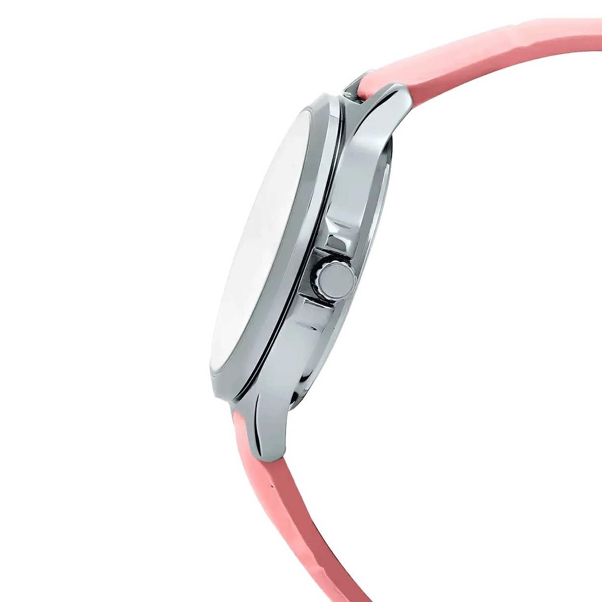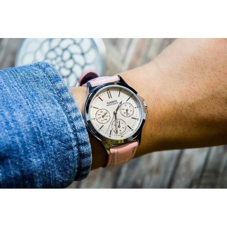 ساعت مچی زنانه/دخترانه کاسیو CASIO با طراحی روزانه بند چرم صورتی با قاب گرد فلزی و صفحه کرم رنگ با موتور ژاپنی و قابلیت تقویم روز و هفته با انرژی باطری و مقاوم در برابر آب تا عمق 30 متر از خانواده ENTICER به همراه یک سال گارانتی بین المللی شرکت پارس