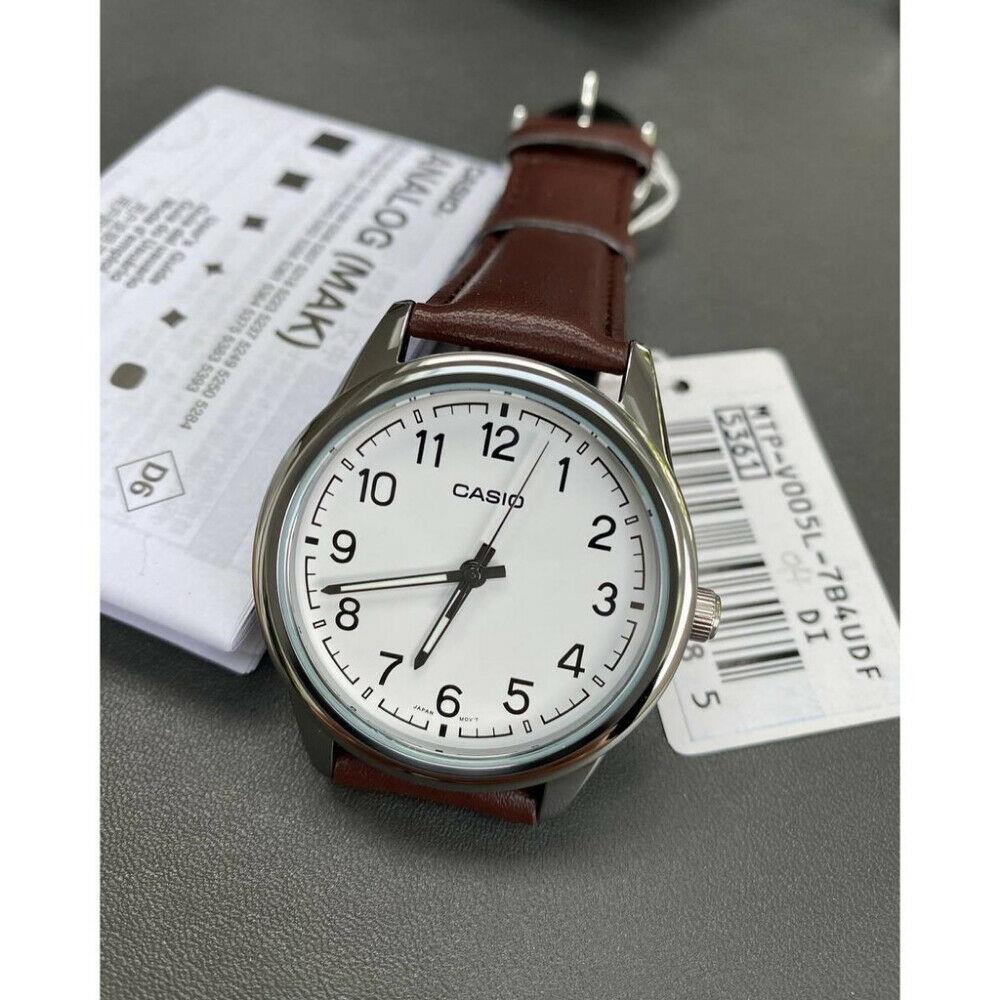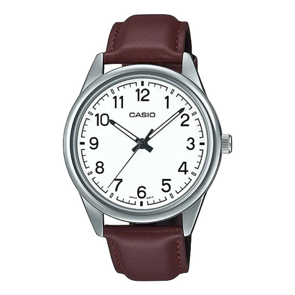 ساعت مچی مردانه/پسرانه کاسیو CASIO با طراحی کلاسیک بند چرم قهوه ای با قاب گرد فلزی و صفحه سفید با درج اعداد انگلیسی با موتور ژاپنی کوارتز و مقاوم در برابر آب تا عمق 30 متر از خانواده Dress به همراه یک سال گارانتی بین المللی شرکت پارس