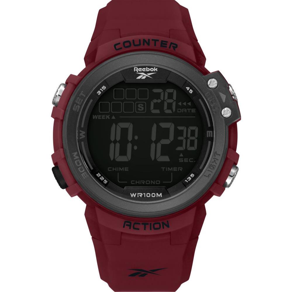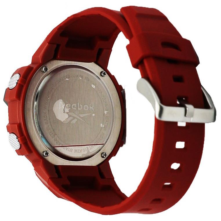 ساعت مچی مردانه/پسرانه ریباک REEBOK با طراحی اسپرت قرمز رنگ با بند سیلیکونی و قاب گرد دو رنگ با صفحه مشکی و نمایشگر دیجیتالی با قابلیت تقویم روز و هفته,کرنومتر,تایمرشمارش معکوس,نور پشت صفحه,آلارم با انرژی باطری و مقاوم در برابر آب تا عمق 100 متر به همراه دو سال گارانتی بین المللی شرکت آرمان گالری