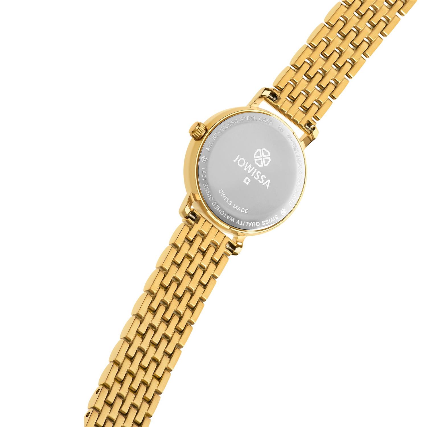 ساعت مچی زنانه جویسا JOWISSA با طراحی روزانه طلایی رنگ بند فلزی با قاب گرد دو رنگ و صفحه سفید با موتور سوییسی و انرژی باطری و مقاوم در برابر آب تا عمق 50 متر به همراه دو سال گارانتی بین المللی شرکت زمردیان