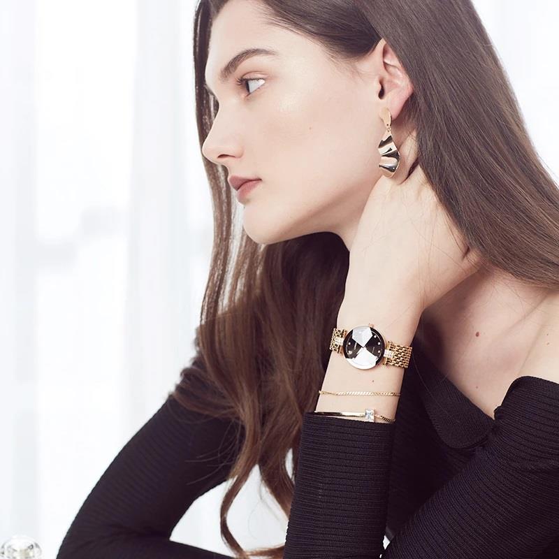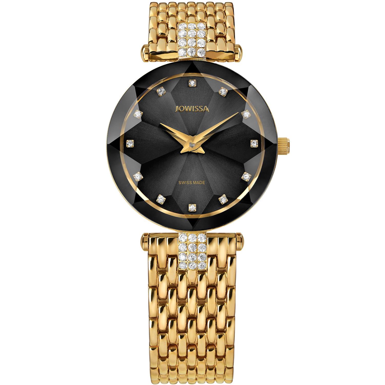 ساعت مچی زنانه جویسا JOWISSA با طراحی مجلسی طلایی رنگ بند فلزی با قاب گرد مزین به نگین با صفحه مشکی و شیشه تراش خورده با موتور سوییسی و انرژی باطری و مقاوم در برابر آب تا عمق 50 متر به همراه دو سال گارانتی بین المللی شرکت زمردیان