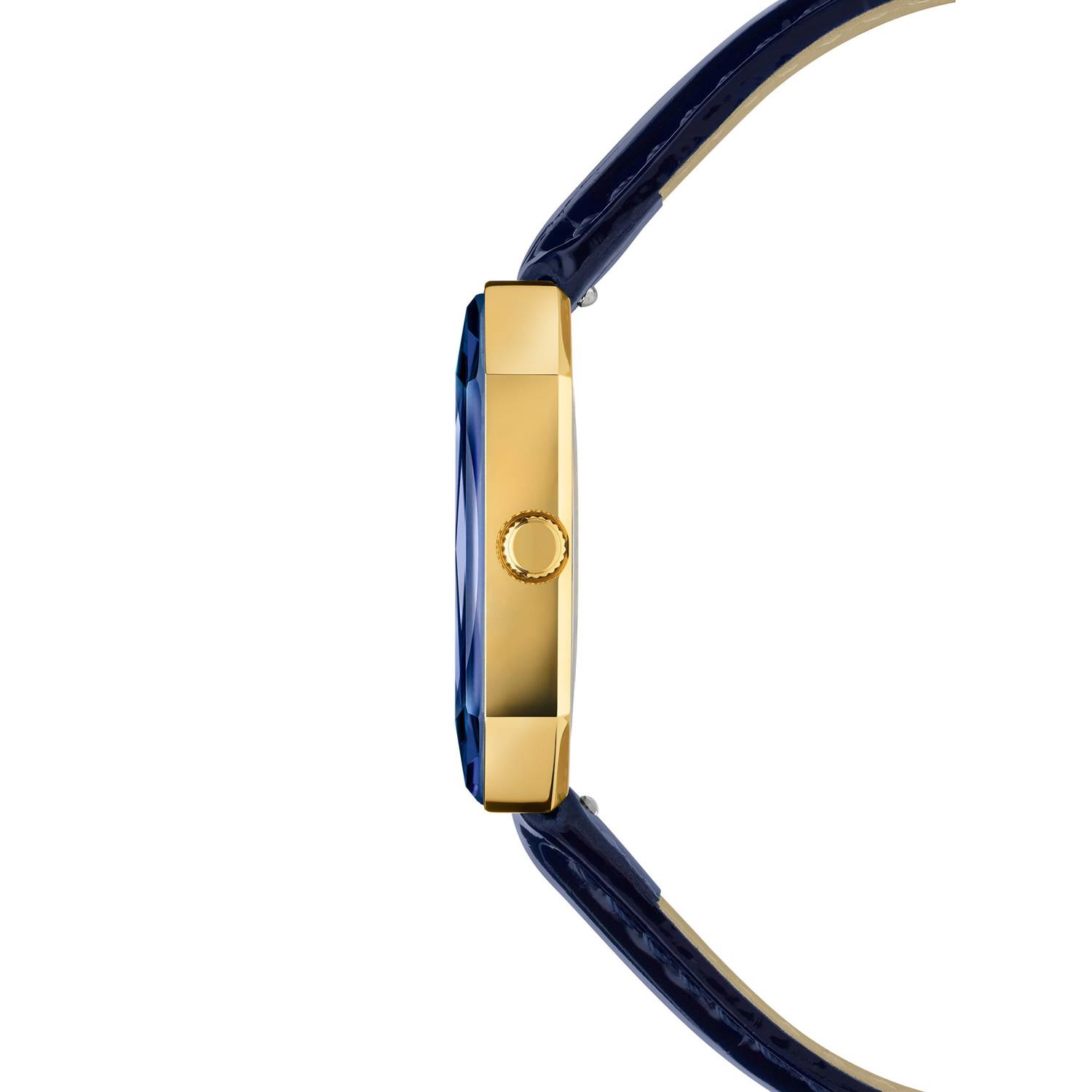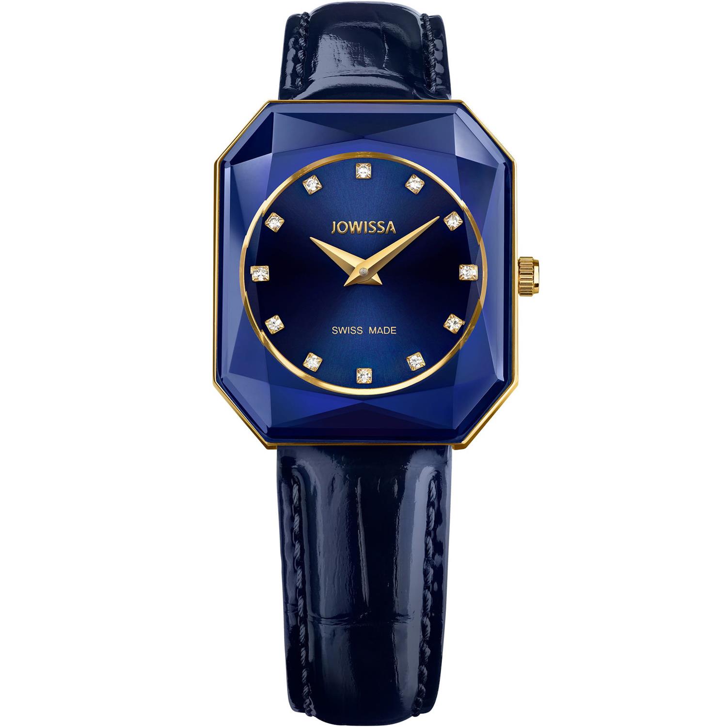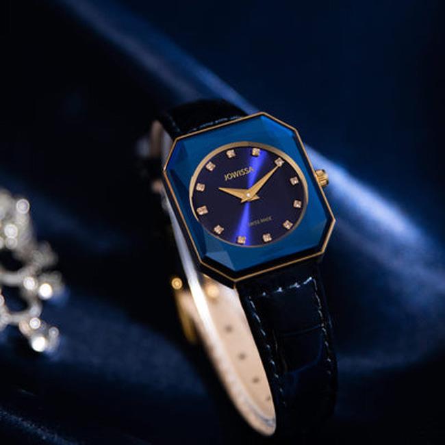 ساعت مچی زنانه جویسا JOWISSA با طراحی روزانه بند چرم سرمه ای رنگ با قاب متفاوت طلایی و صفحه سرمه ای مزین به نگین با شیشه تراش خورده و موتور سوییسی با انرژی باطری و مقاوم در برابر آب تا عمق 50 متر به همراه دو سال گارانتی بین المللی شرکت زمردیان