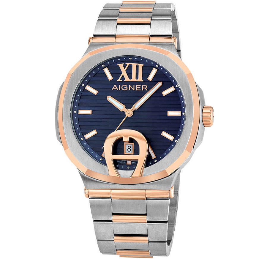ساعت مچی مردانه Aigner با طراحی کلاسیک بند فلزی دو رنگ و قاب متفاوت مسی استیل و صفحه گرد سرمه ای با قابلیت داشتن تقویم,شب نما و موتور سوئیسی با انرژی باتری و مقاومت در برابر اب تا عمق 30 متر به همراه 2 سال گارانتی بین المللی اریا زمان