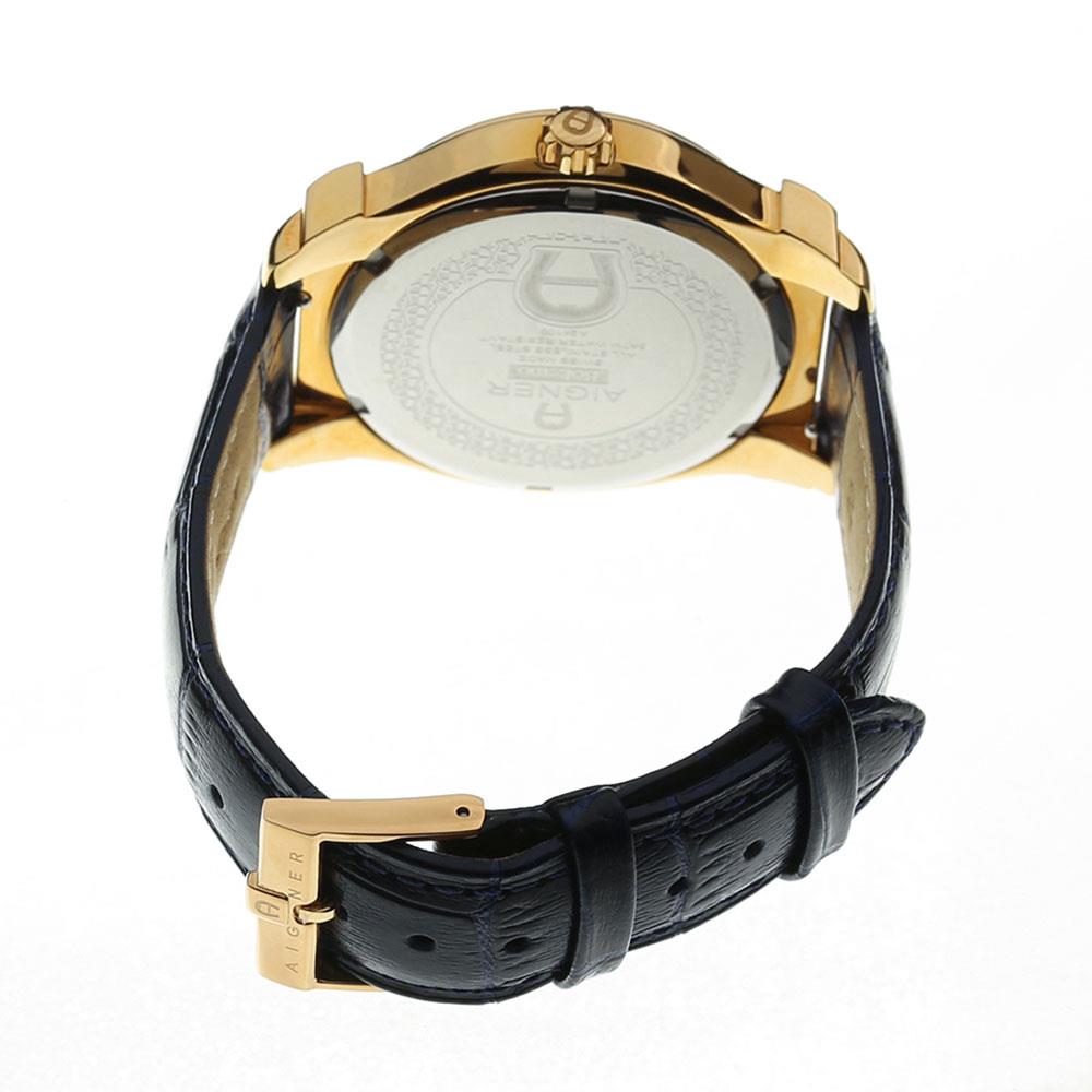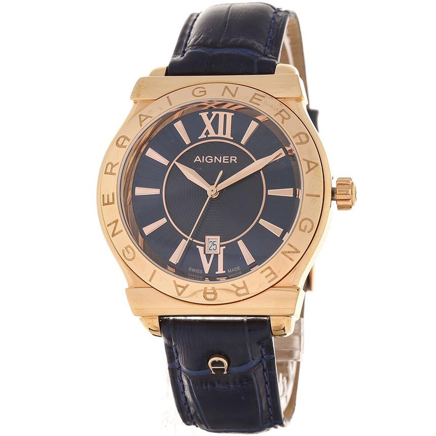 ساعت مچی مردانه Aigner با طراحی کلاسیک بند چرمی و قاب فلزی رزگلد وصفحه گرد سرمه ای و قابلیت داشتن تقویم با موتورسوئیسی و انرژی باتری و مقاومت در برابر اب تا عمق 30 متر به همراه 2 سال گارانتی بین المللی اریا زمان